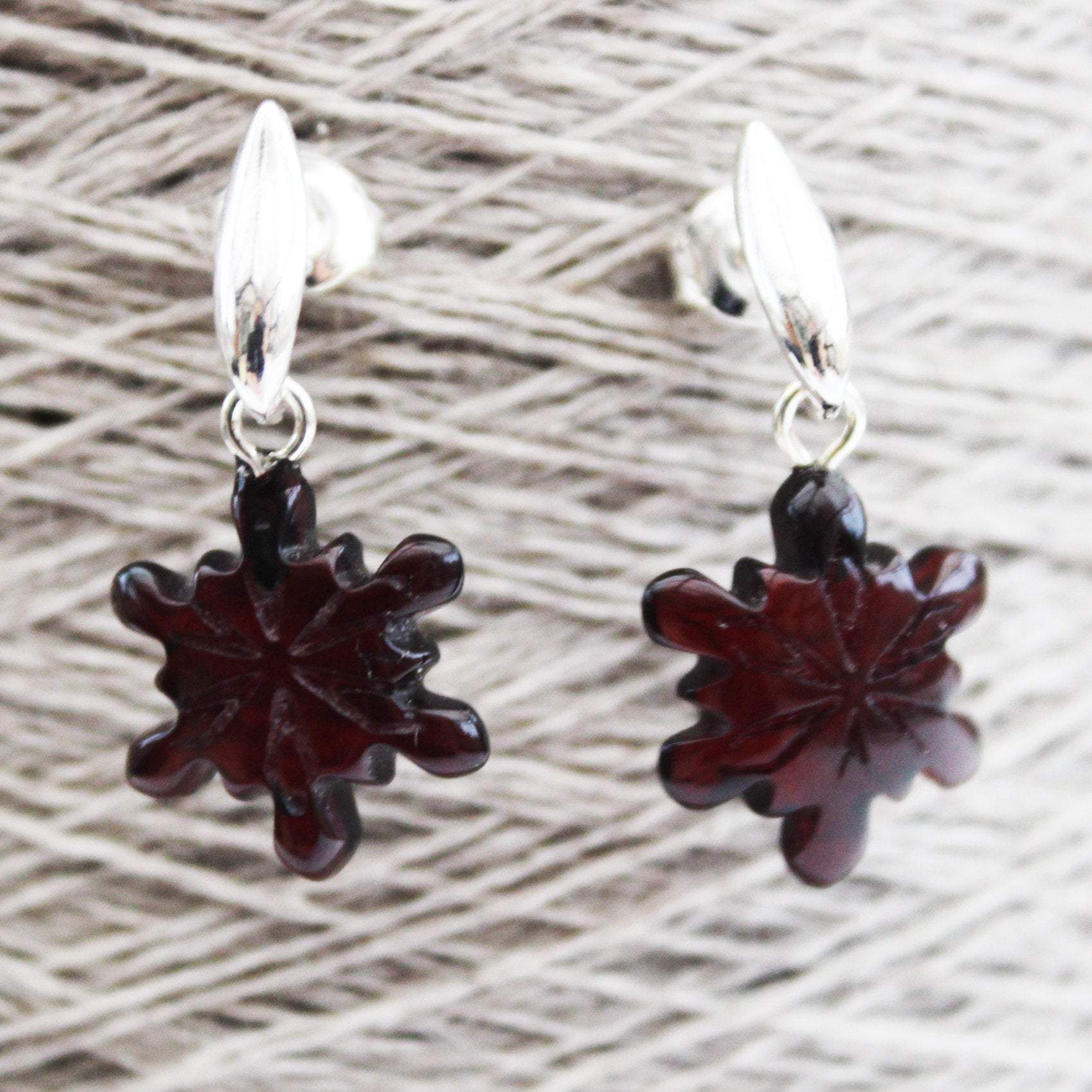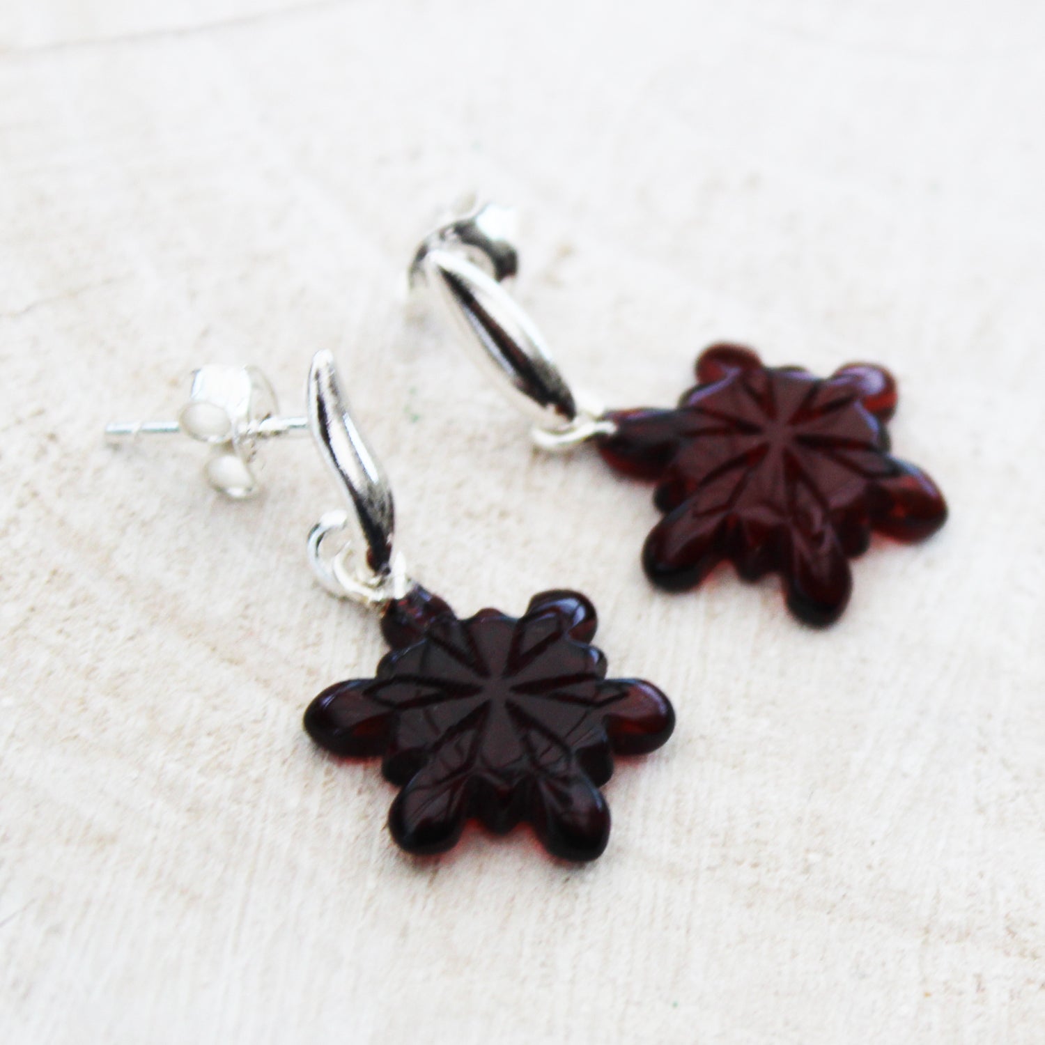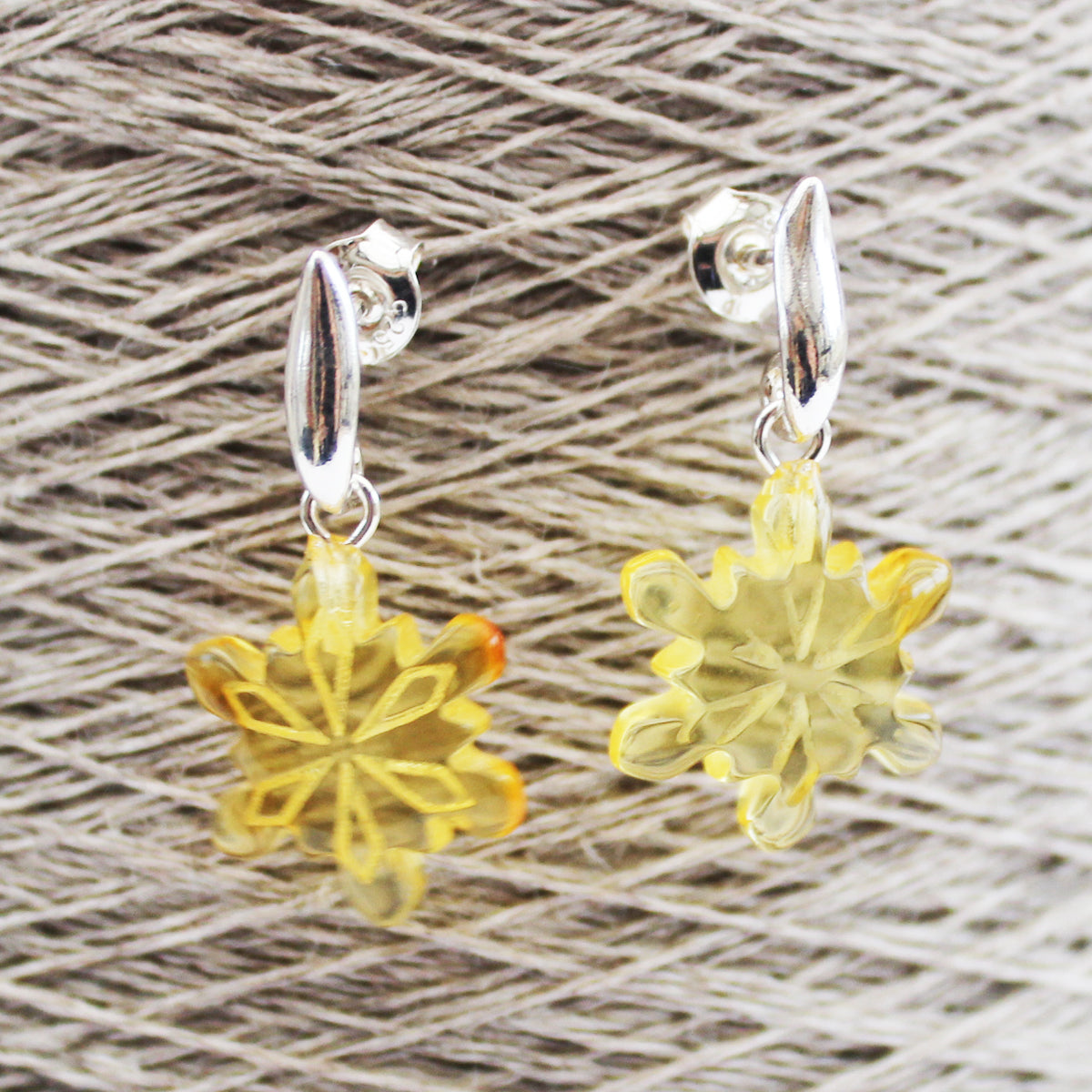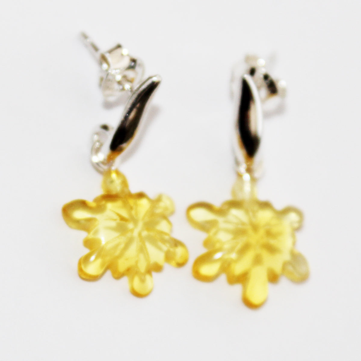 Creatively Hand-carved Baltic Honey Amber Studs 'Snowflakes' with sterling silver back finding.