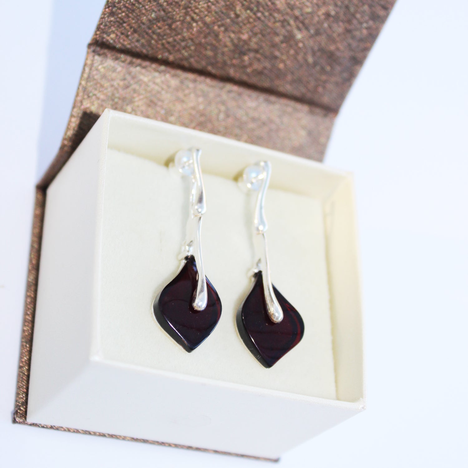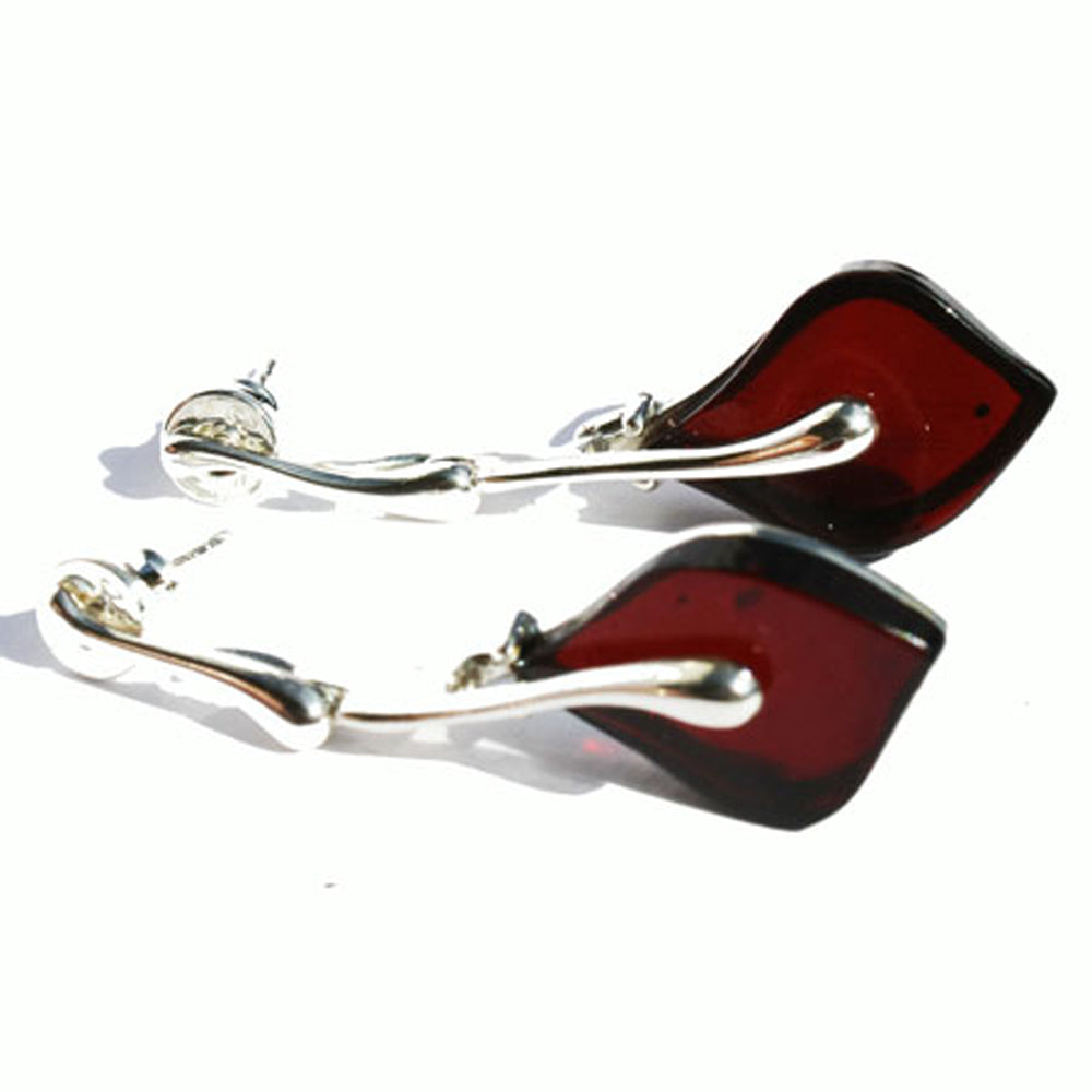 Pretty designer shaped honey or cherry coloured amber drop earrings with sterling silver 925 fittings. With stud fittings.