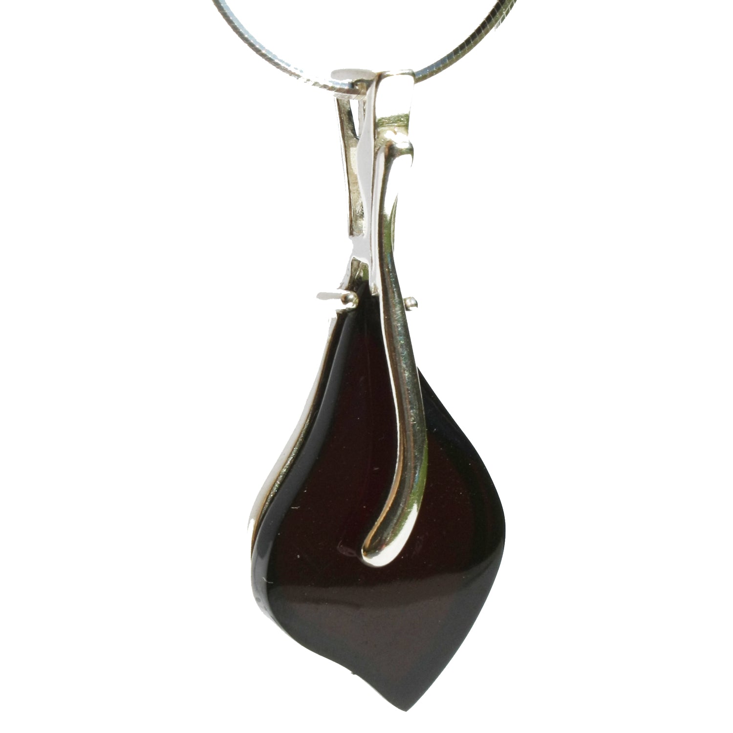 Pretty designer shaped honey or cherry coloured amber pendant with sterling silver 925 fittings.