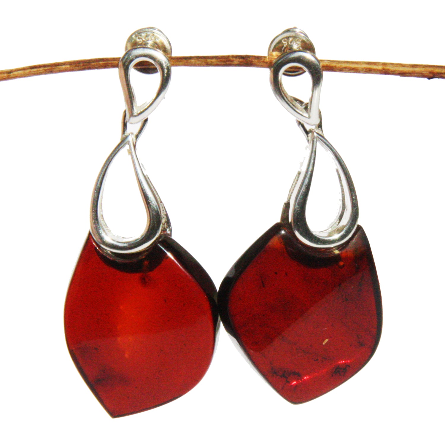 Dark Cherry or Cognac Amber Earrings with single large amber pieces made of sterling silver settings and genuine baltic amber.