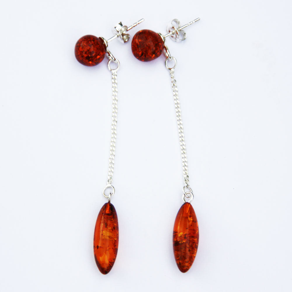 Honey Amber Long and Dangle Earrings - with sterling silver fittings and drop shaped amber.
