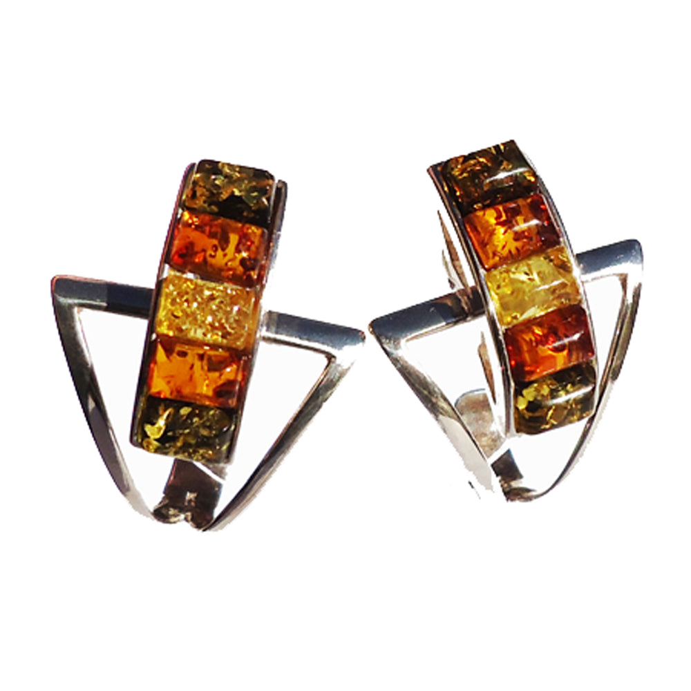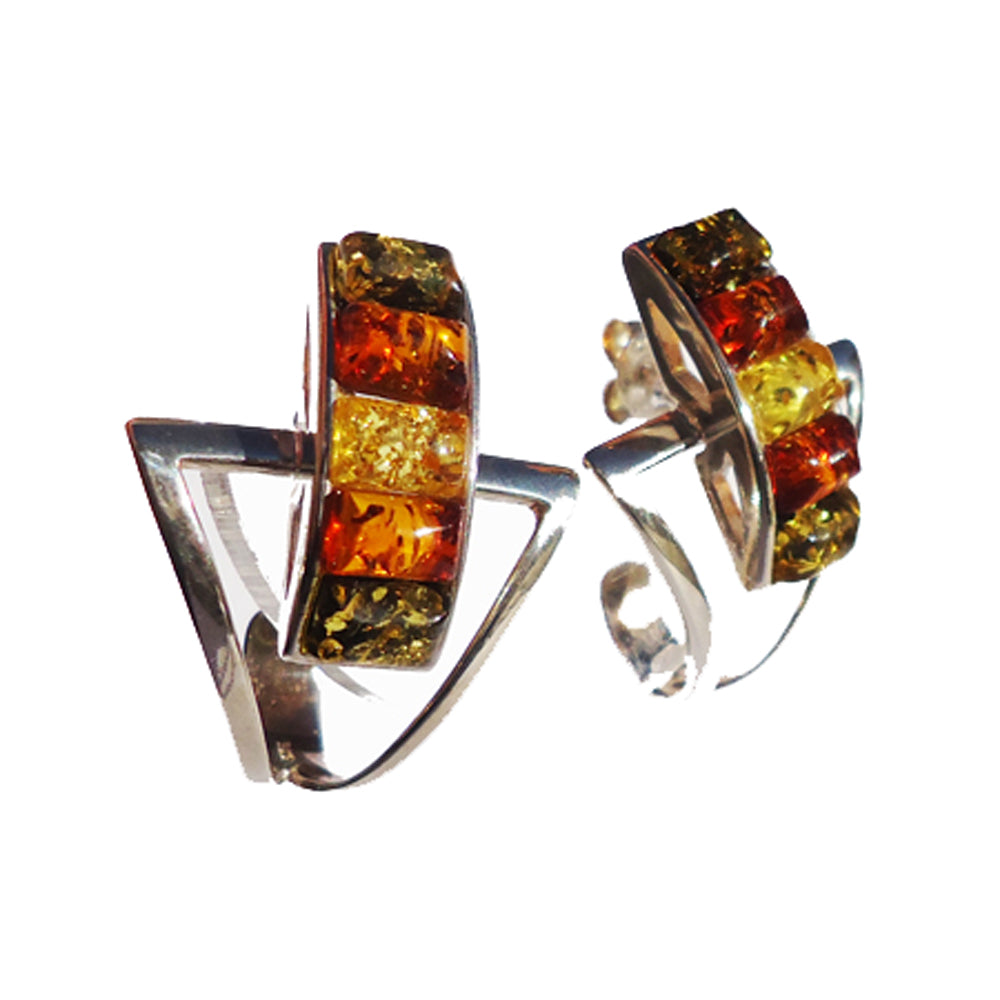 Modern sterling silver 925 fittings and five small square multicolour baltic amber pieces used to make this stunning and unique stud earrings. Amber is smoothly polished to show off the natural content and shine. Also we are very pleased to be able to offer the matching necklace-pendant.