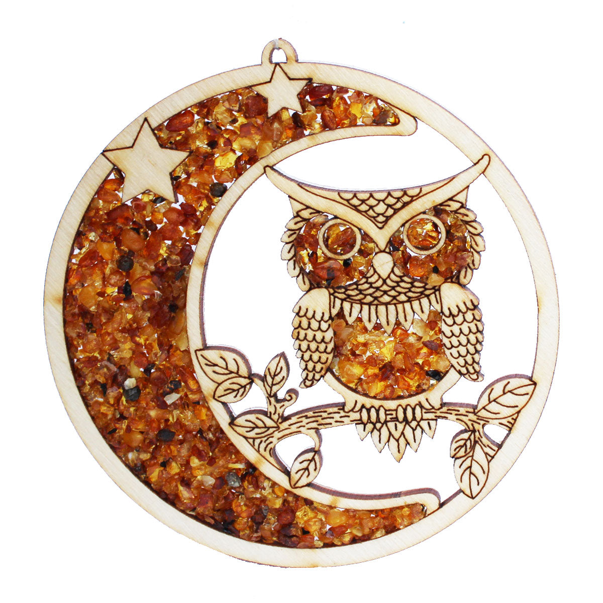 Amber decorated wooden hangings, are a beautiful and sparkling addition to your home. It will help you to relax after a busy day too. Reflected sunlight by Amber acts as a soothing therapy. The wooden decoration is accurately cut by laser and hand decorated with natural Baltic amber. We can create your own shape and your own design, please get in touch for unique personalised orders.