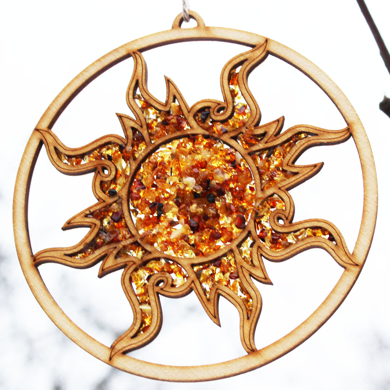 Amber decorated wooden hangings, are a beautiful and sparkling addition to your home. It will help you to relax after a busy day too. Reflected sunlight by Amber acts as a soothing therapy. The wooden decoration is accurately cut by laser and hand decorated with natural Baltic amber. We can create your own shape and your own design, please get in touch for unique personalised orders.
