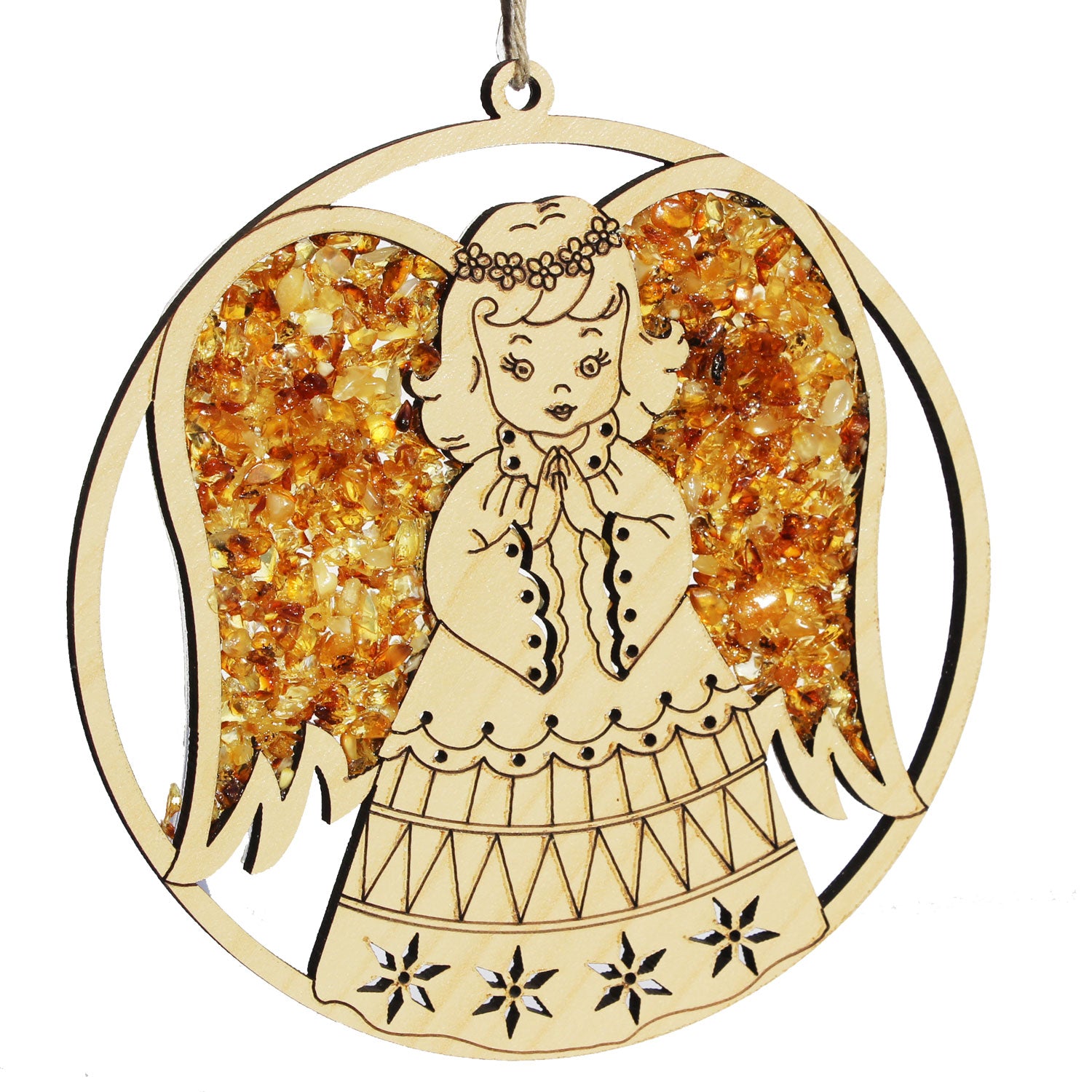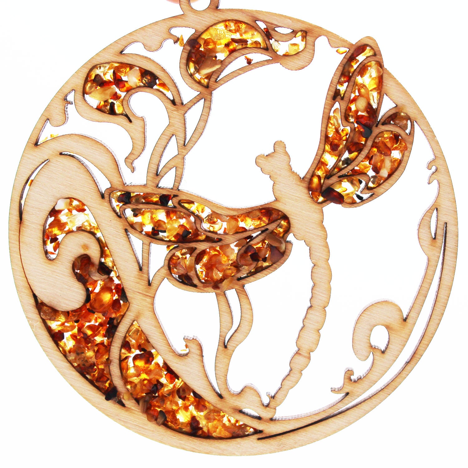 Amber decorated wooden hangings, are a beautiful and sparkling addition to your home. It will help you to relax after a busy day too. Reflected sunlight by Amber acts as a soothing therapy. The wooden decoration is accurately cut by laser and hand decorated with natural Baltic amber. We can create your own shape and your own design, please get in touch for unique personalised orders.