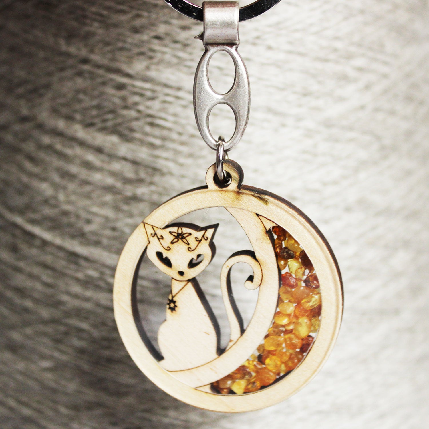 Beautiful Small Cat Keyring made of wood and filled with genuine Baltic Amber, Keychain, Charm for your handbag. Unique and surprising gift
