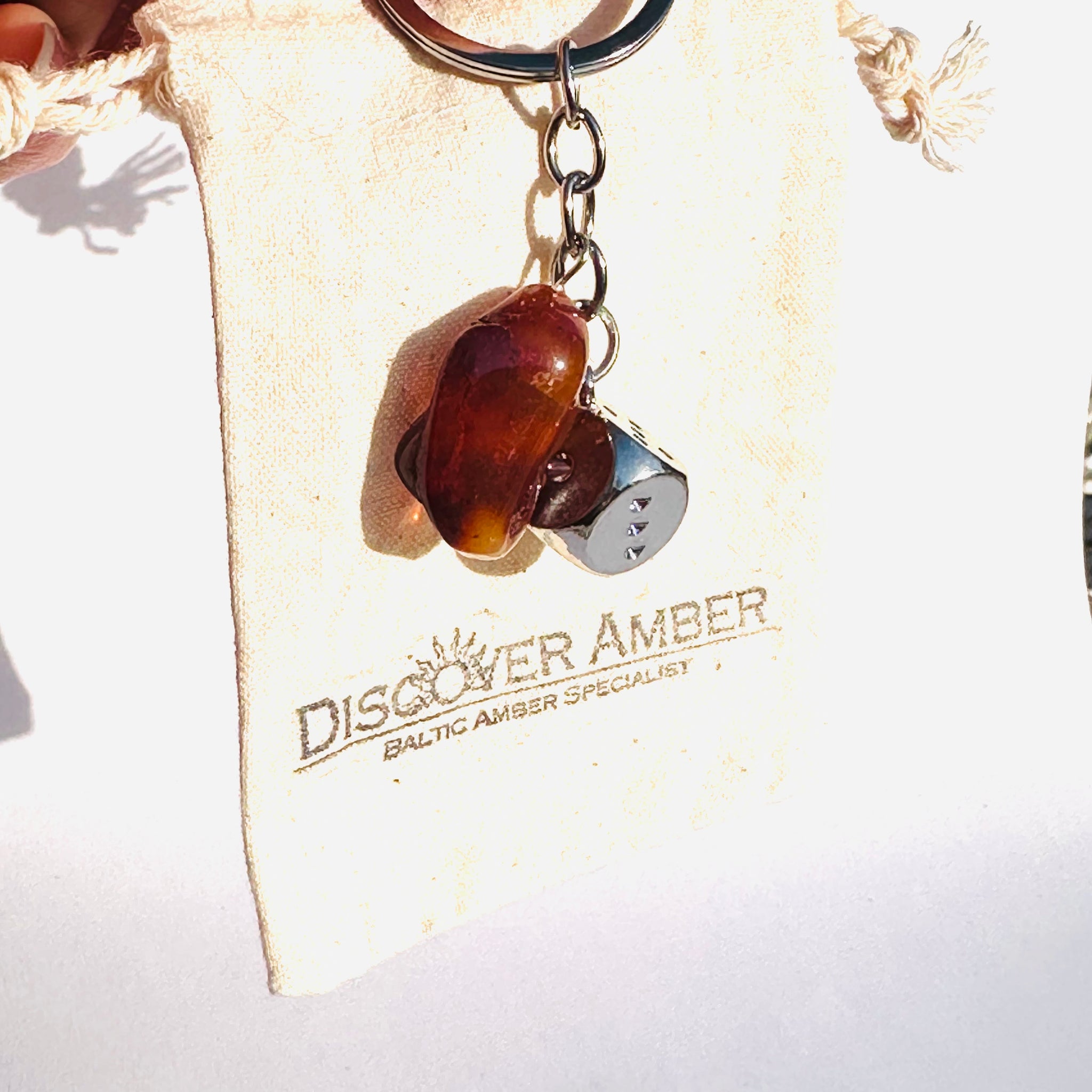Keyring Dice with Amber charm for luck, perfect unique gift. Lovely accessory for keys or handbag. Keychains and Lanyards, amber accessory