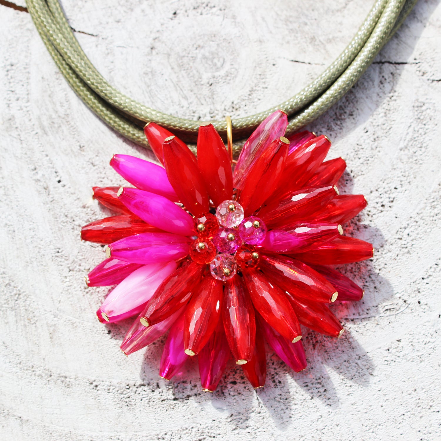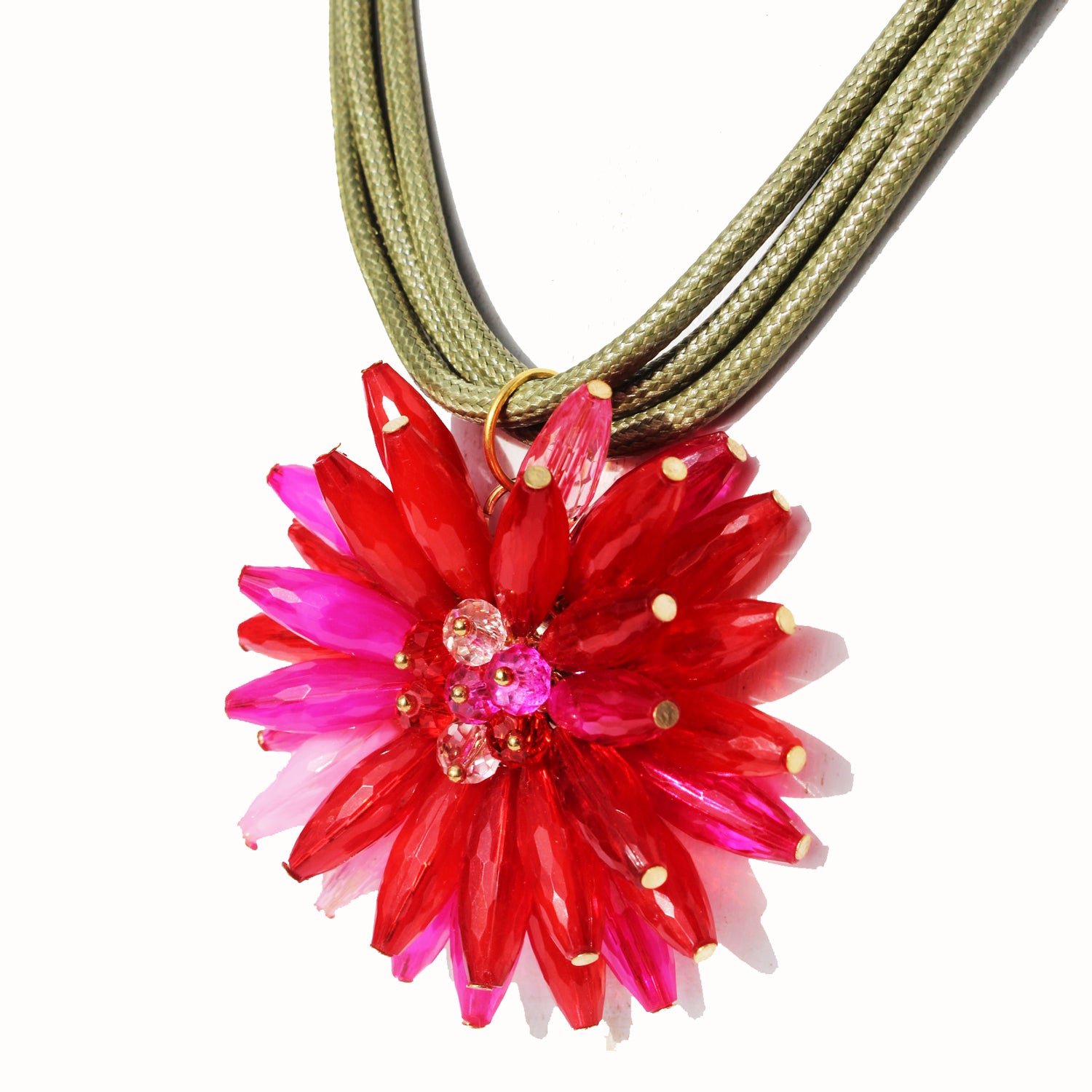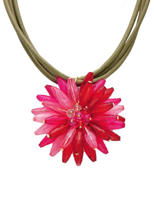Flirty, floral and completely distinctive, this flower power necklace is perfect for unleashing the earth goddess within. The colours take their cue from nature, with a leaf-green, multi-layer cord holding the multi colour floral centrepiece in place. With colours ranging from vibrant fuchsia to deep blue, this necklace truly captivates an audience.