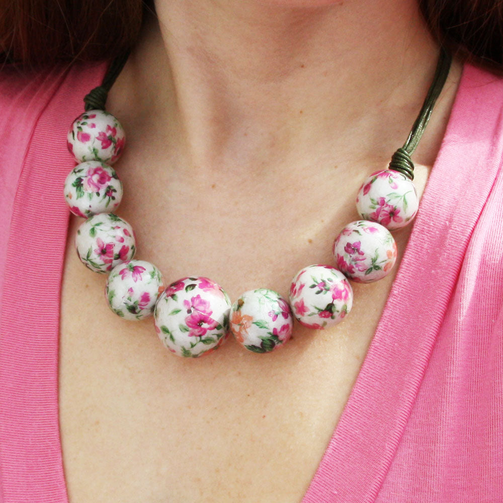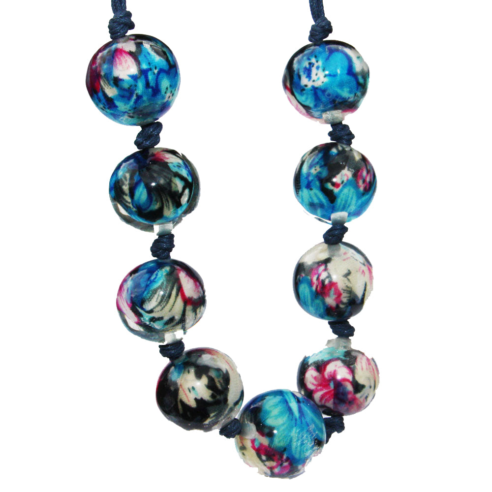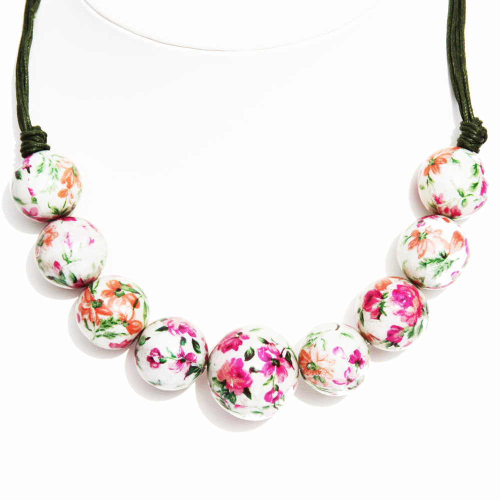 Floral Bead Necklace with each bead having a beautiful floral pattern . It has clasp fastening and adjusts up to 20 inch Floral Bead Necklace with each bead having a beautiful floral pattern . It has clasp fastening and adjusts up to 20 inch