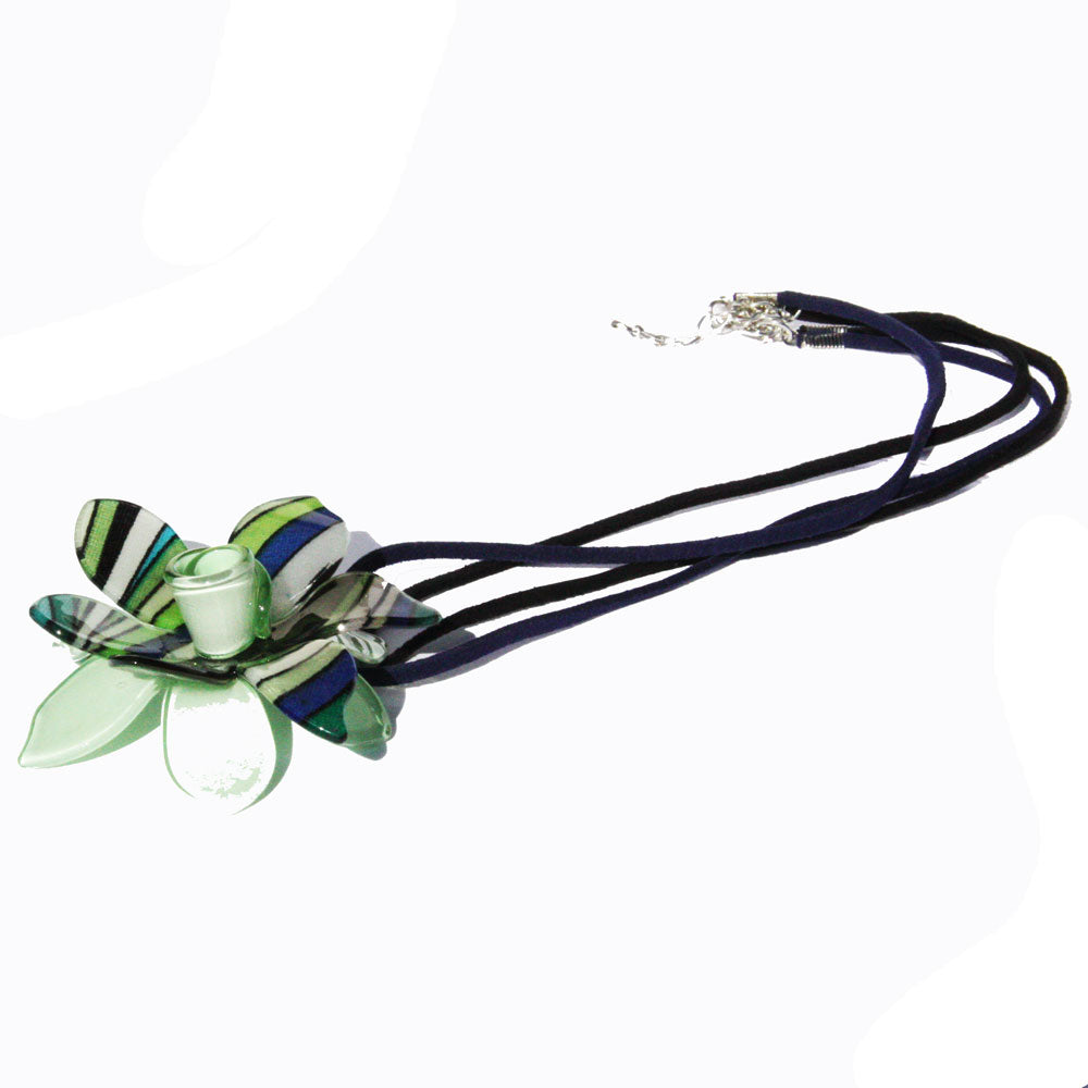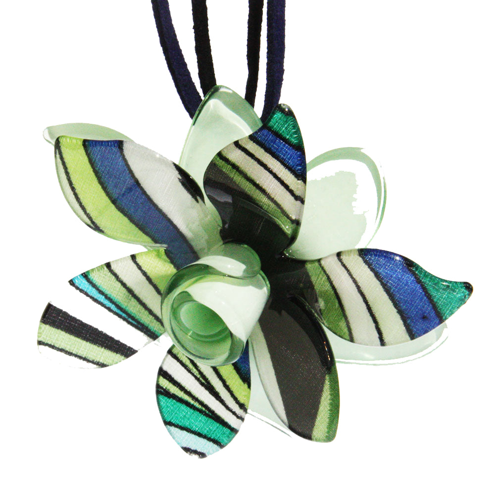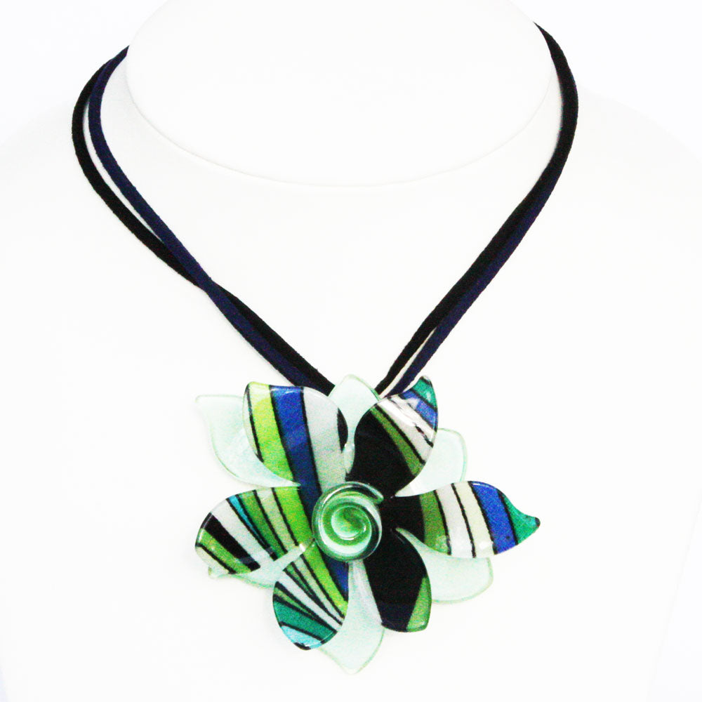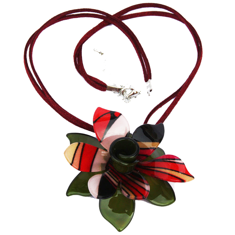 A stunning resin green flower with a pattern middle on strung red suede. It has clasp fastening and adjusts up to 21 inch.