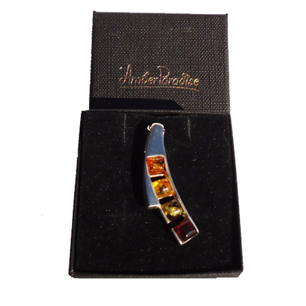 Modern sterling silver 925 fittings and four small square multicolour baltic amber pieces used to make this pendant. Amber is smoothly polished to show off the natural content and shine. Also we are very pleased to be able to offer the matching earrings.