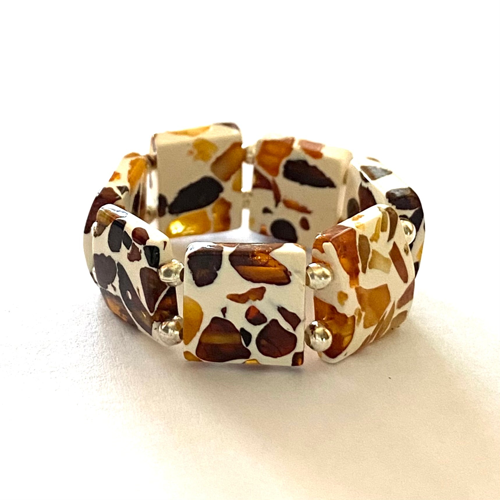 Made out of carved Dalmatian Pattern rectangular amber beads. Handcrafted in Lithuania. Baltic Amber Stretch contain zero metal. This ring will perfectly adjust to your finger size. Our Unique Baltic Amber Ring Collection contains only one off pieces. It offers you a huge choice of amber colours and a fantastic assortment of exclusive designs. We guarantee you genuine quality of amber, 30-90 million years old, which comes from the Baltic Sea area.