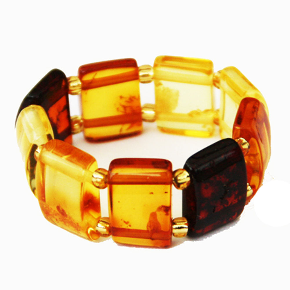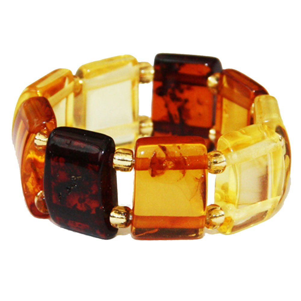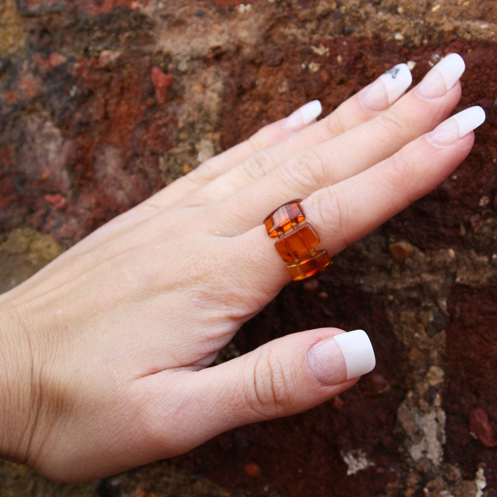 Made out of carved Honey, Multi or Butterscotch rectangular amber beads. Handcrafted in Lithuania. Baltic Amber Stretch contain zero metal. This ring will perfectly adjust to your finger size. Our Unique Baltic Amber Ring Collection contains only one off pieces. It offers you a huge choice of amber colours and a fantastic assortment of exclusive designs. We guarantee you genuine quality of amber, 30-90 million years old, which comes from the Baltic Sea area.