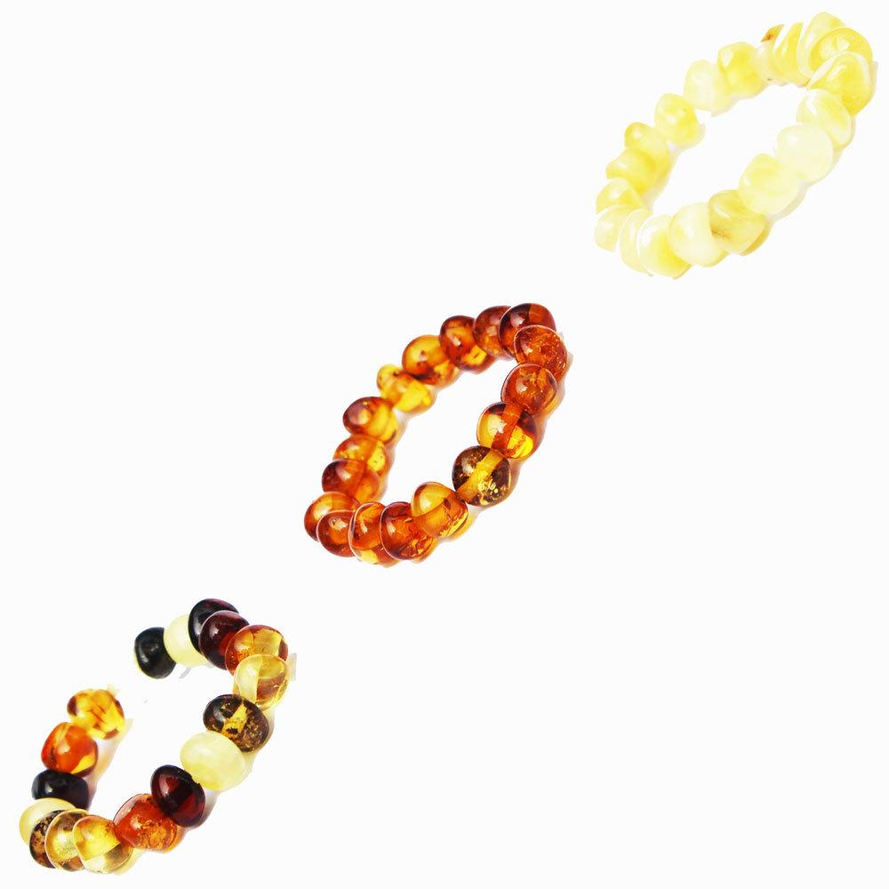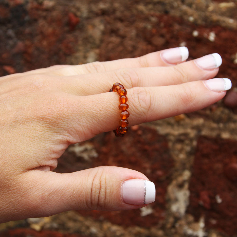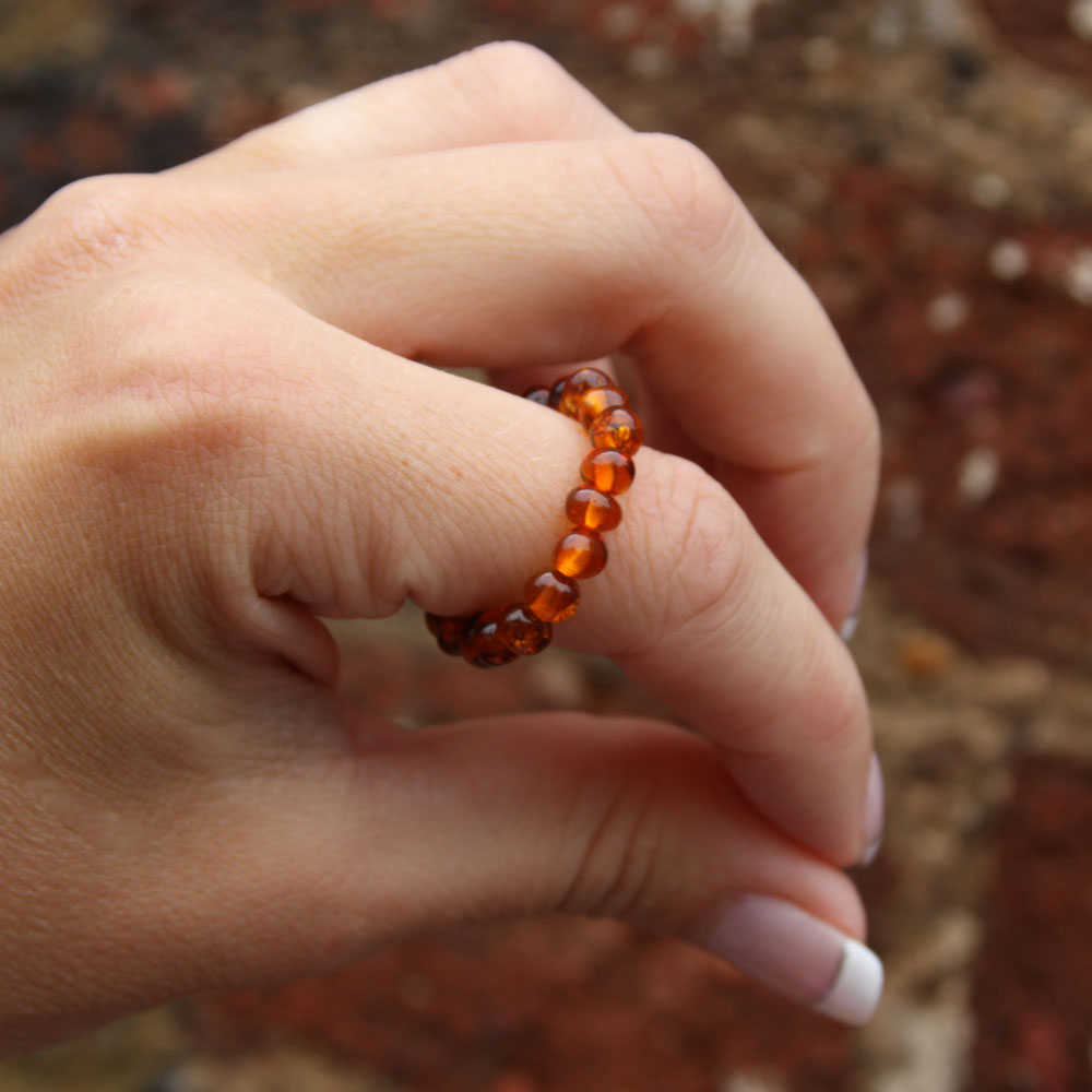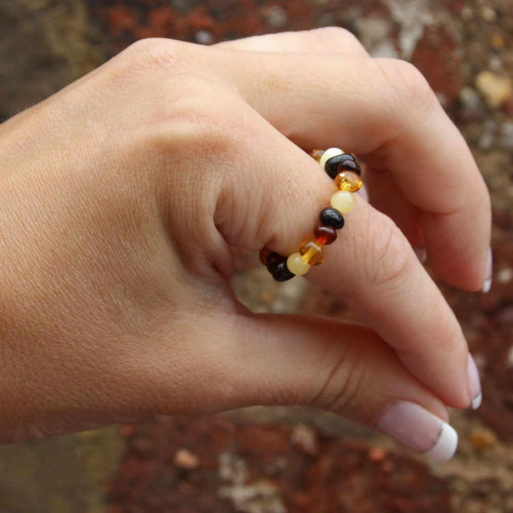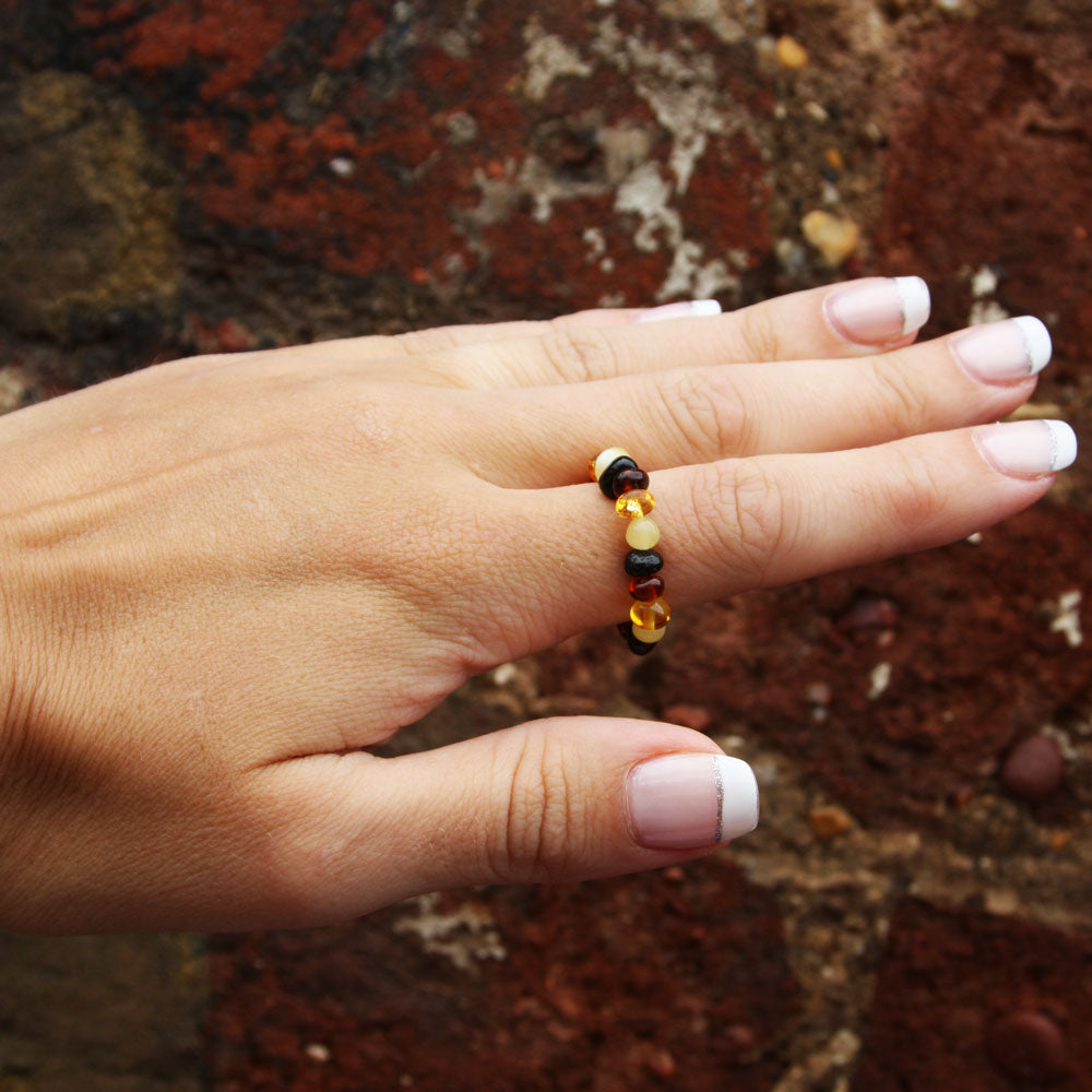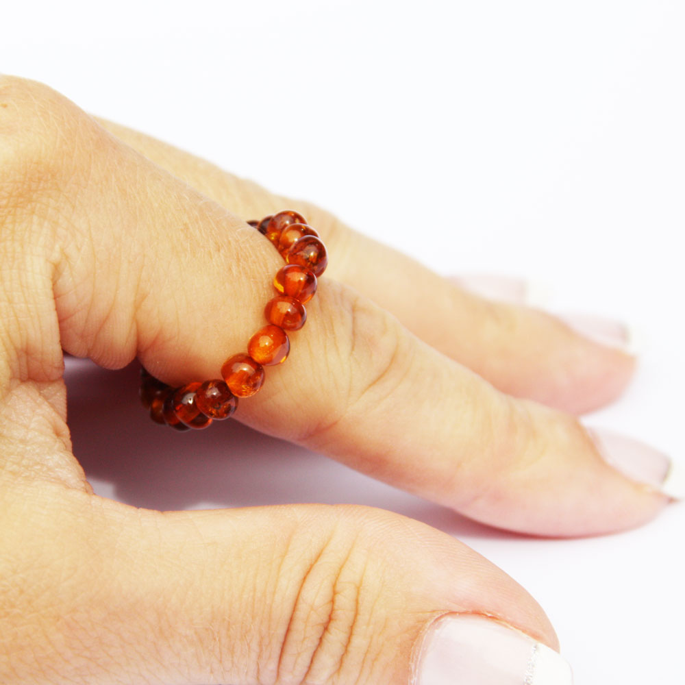 Genuine Baltic Amber stretch ring made out of carved cognac/butterscotch/multicolour round amber beads. Baltic Amber Stretch contains zero metal. This ring will perfectly adjust to your finger size.