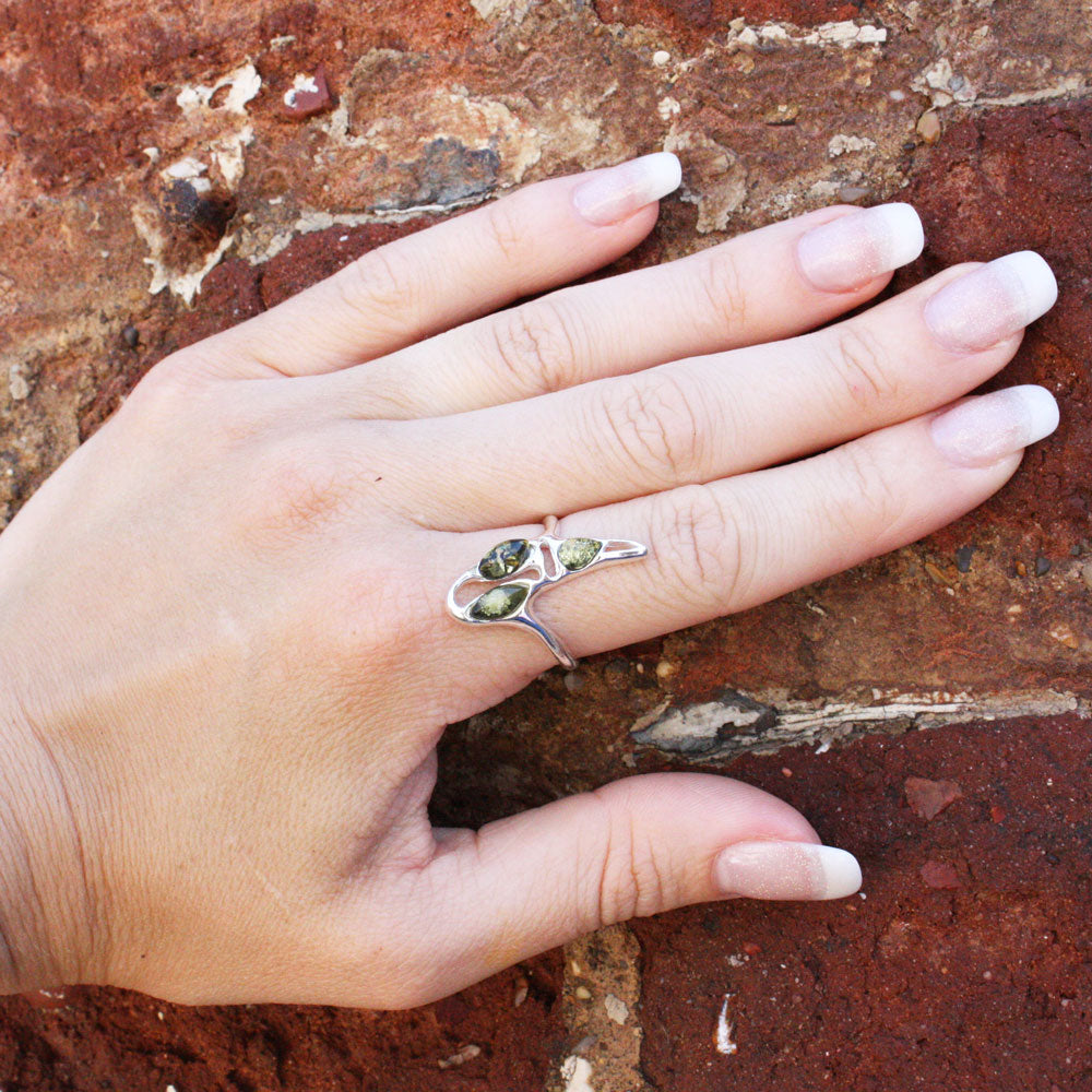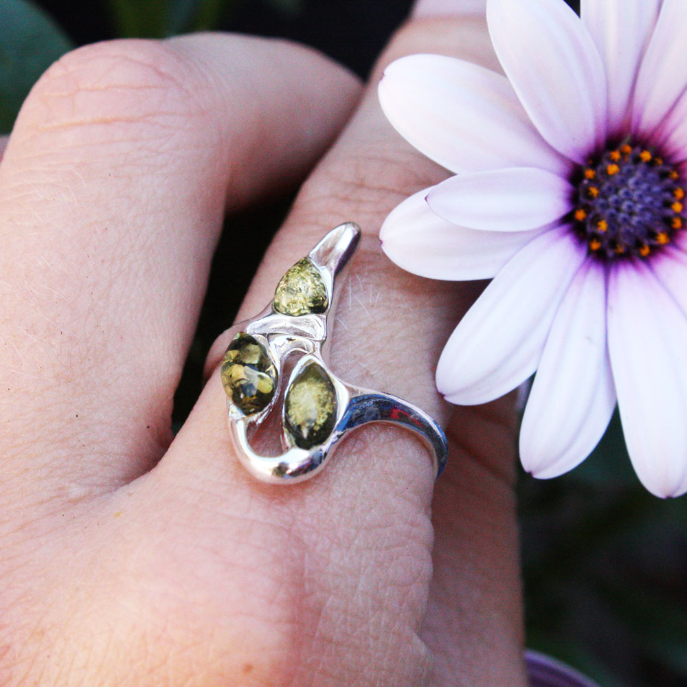 Fancy baltic amber ring design. Genuine Amber is set in sterling silver 925. Honey, green or multicolour amber options gemstone jewellery
