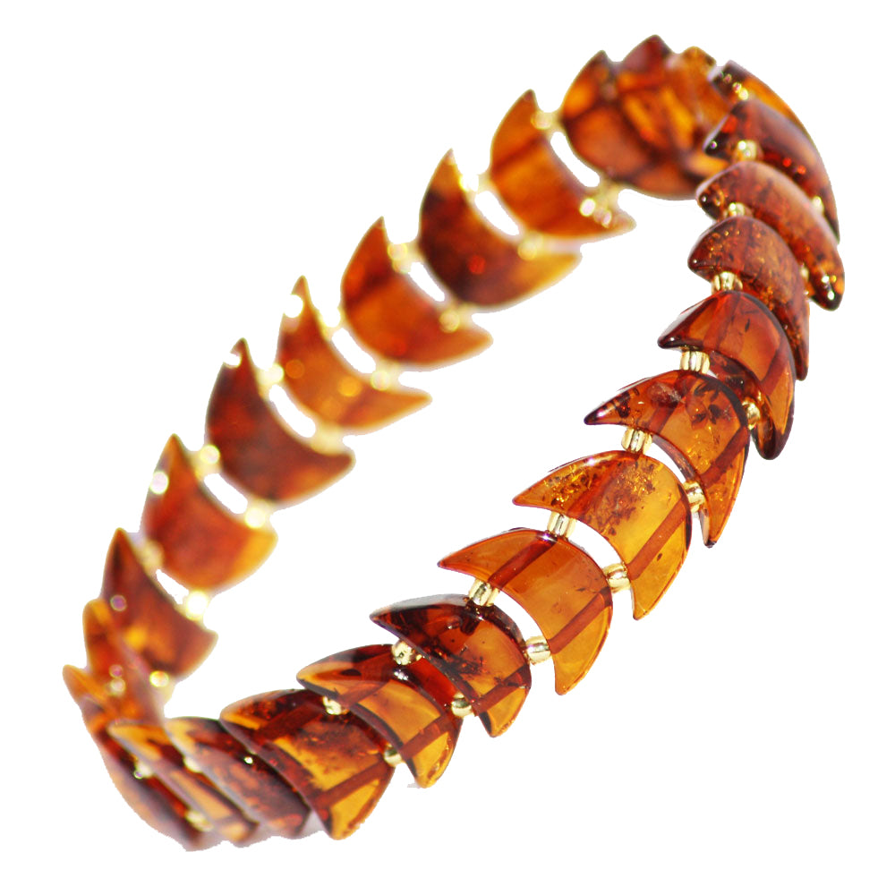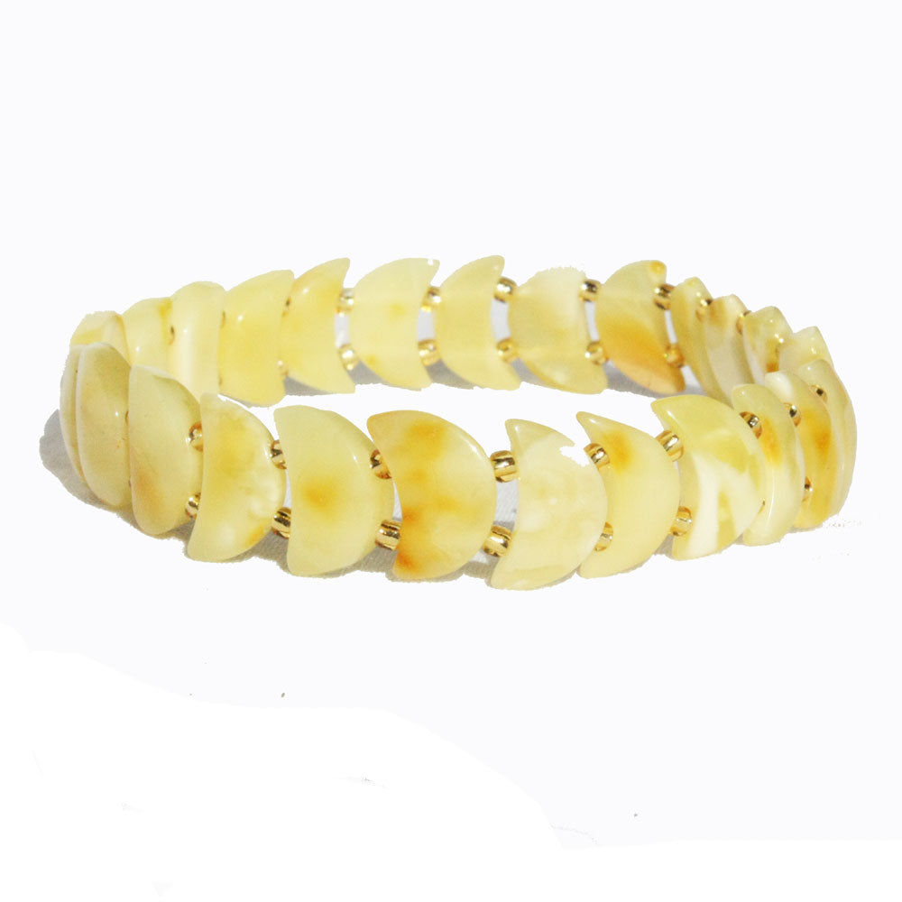 Romantic Baltic amber moon bracelet/bangle made with moon-shaped amber beads. Two elastic strings expand to fit all wrists so need no clasp and will expand to fit all wrists. Amber Bracelet comes in a beautiful gift box. Also, we are very pleased to be able to offer matching necklaces or earrings. All pieces are unique and may vary slightly.