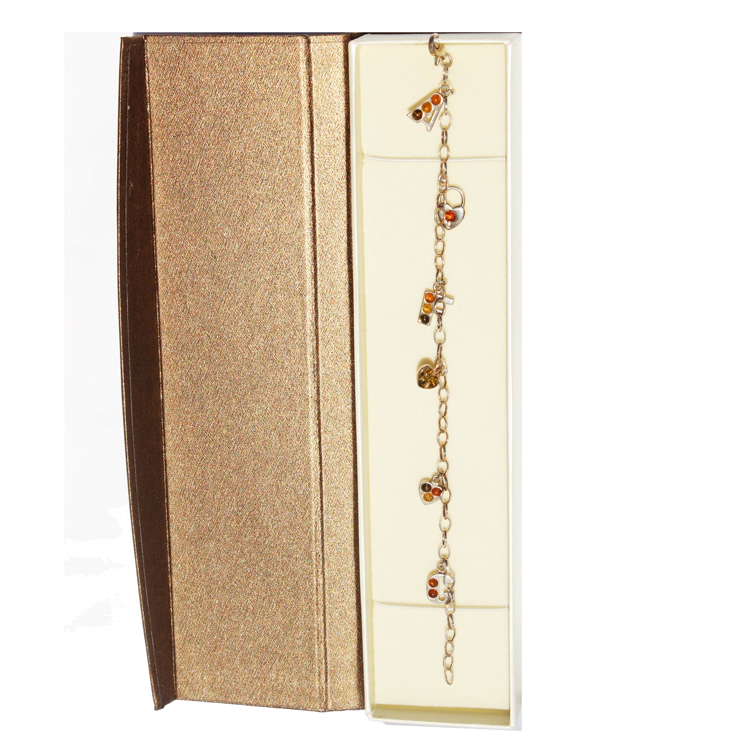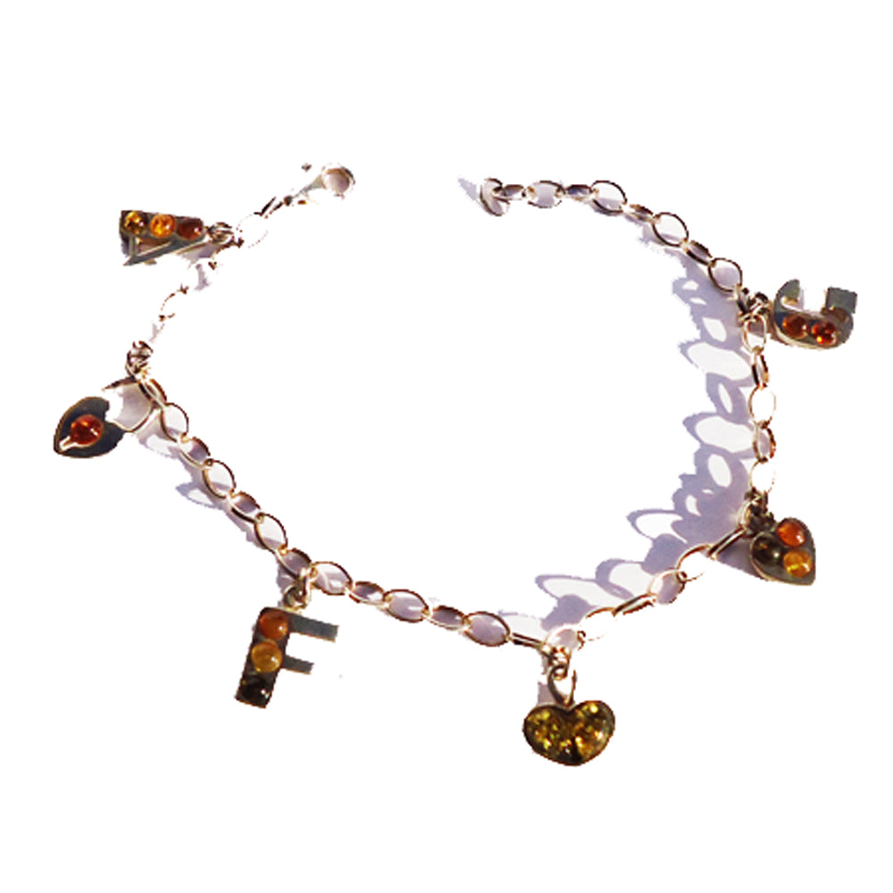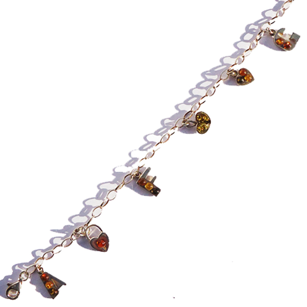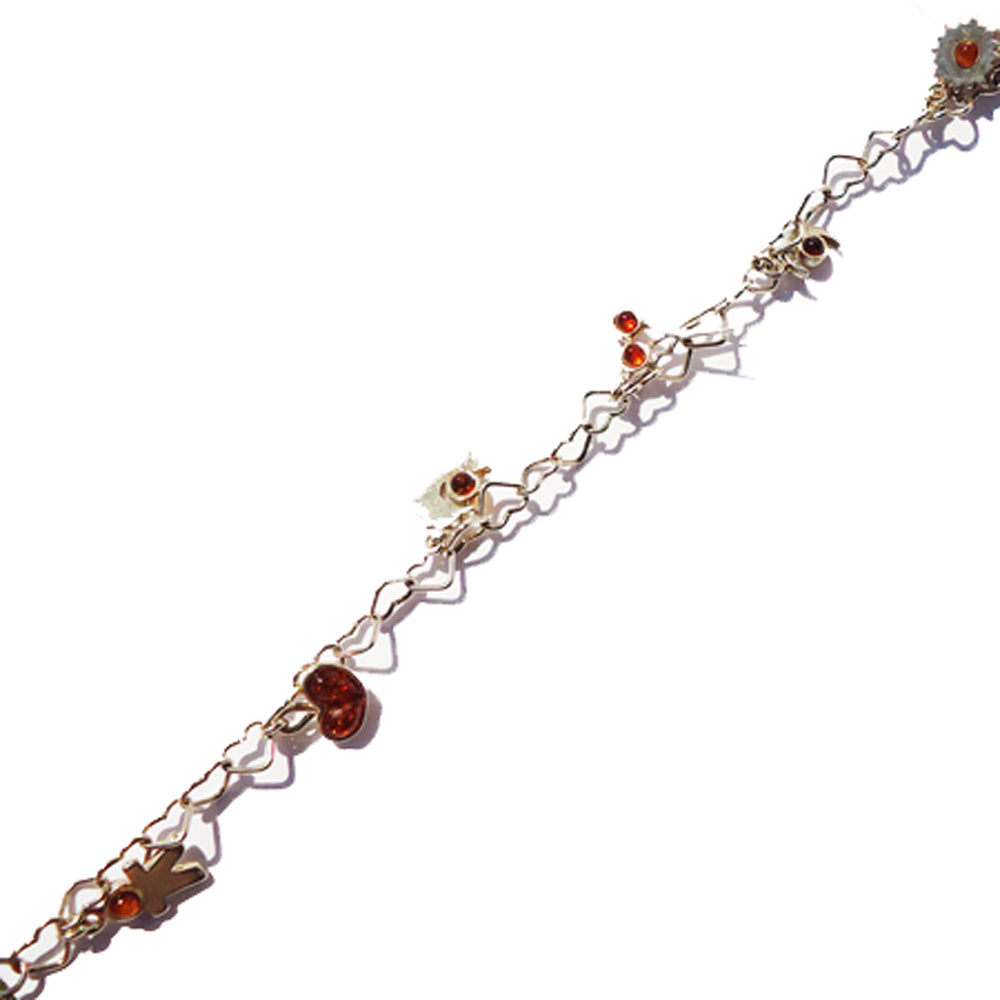 Fancy sterling silver 925 heart chain bracelet and six charming charms with honey baltic amber