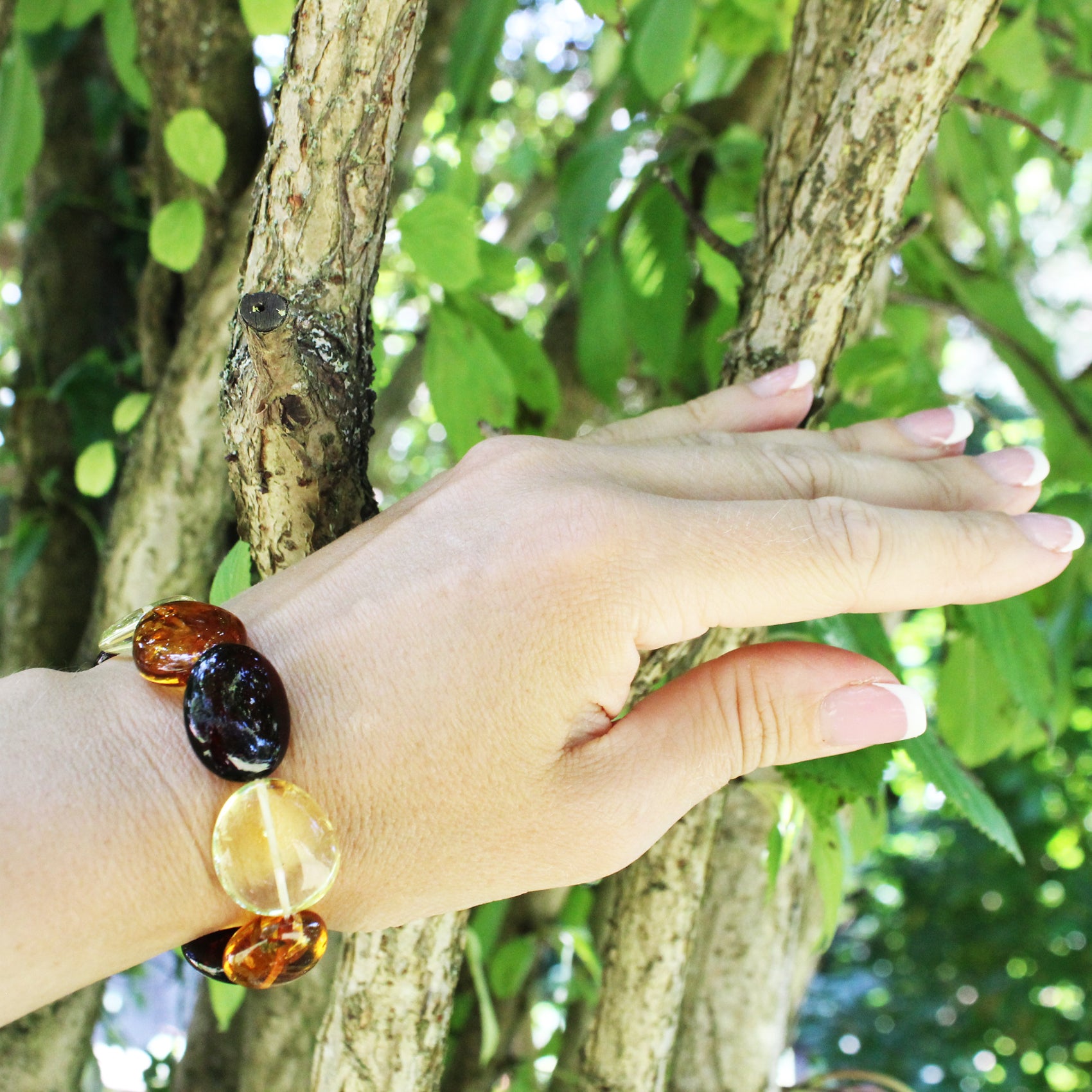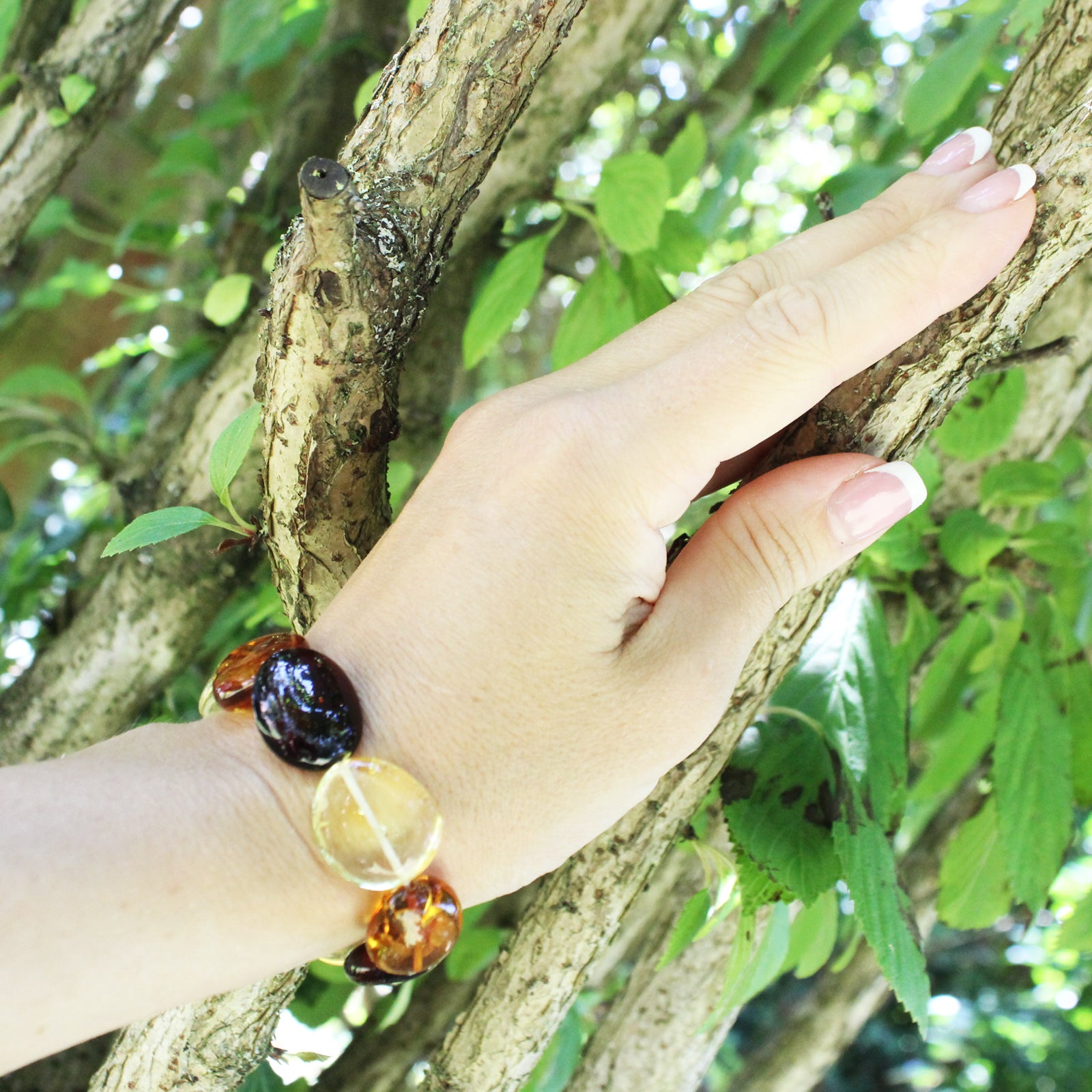 This handmade multi-colour Baltic amber bracelet is crafted from polished circular amber beads in warm natural tones including honey, butterscotch, cherry, and multicolour mixes. Smoothly polished to reveal natural inclusions and shine, this bracelet offers a vibrant and unique look suitable for daily wear or gifting.