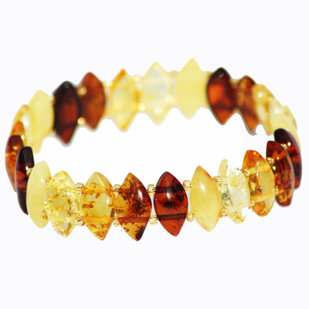 Small ad cute Baltic amber drop bracelet/bangle made of large honey amber marquise-shaped stones. Two elastic strings expand to fit all wrists