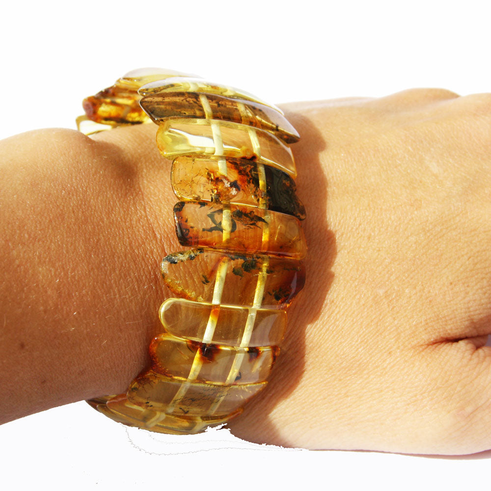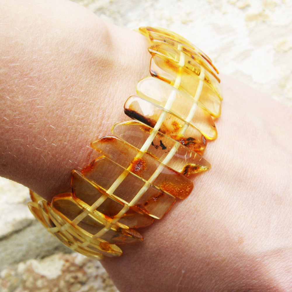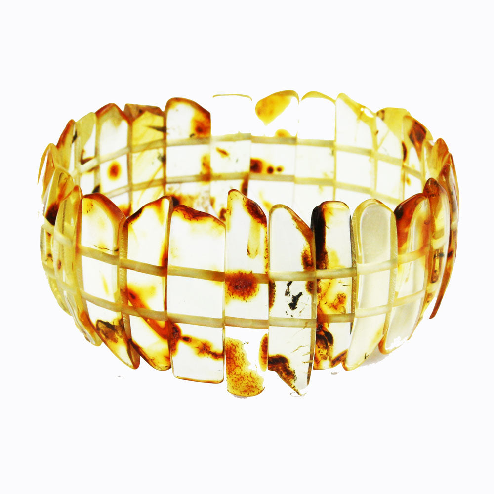 Beautiful Amber is smoothly polished to show off the natural content and shine. It is made of natural uneven baltic amber pieces. Two elastic strings expand to fit all wrists.