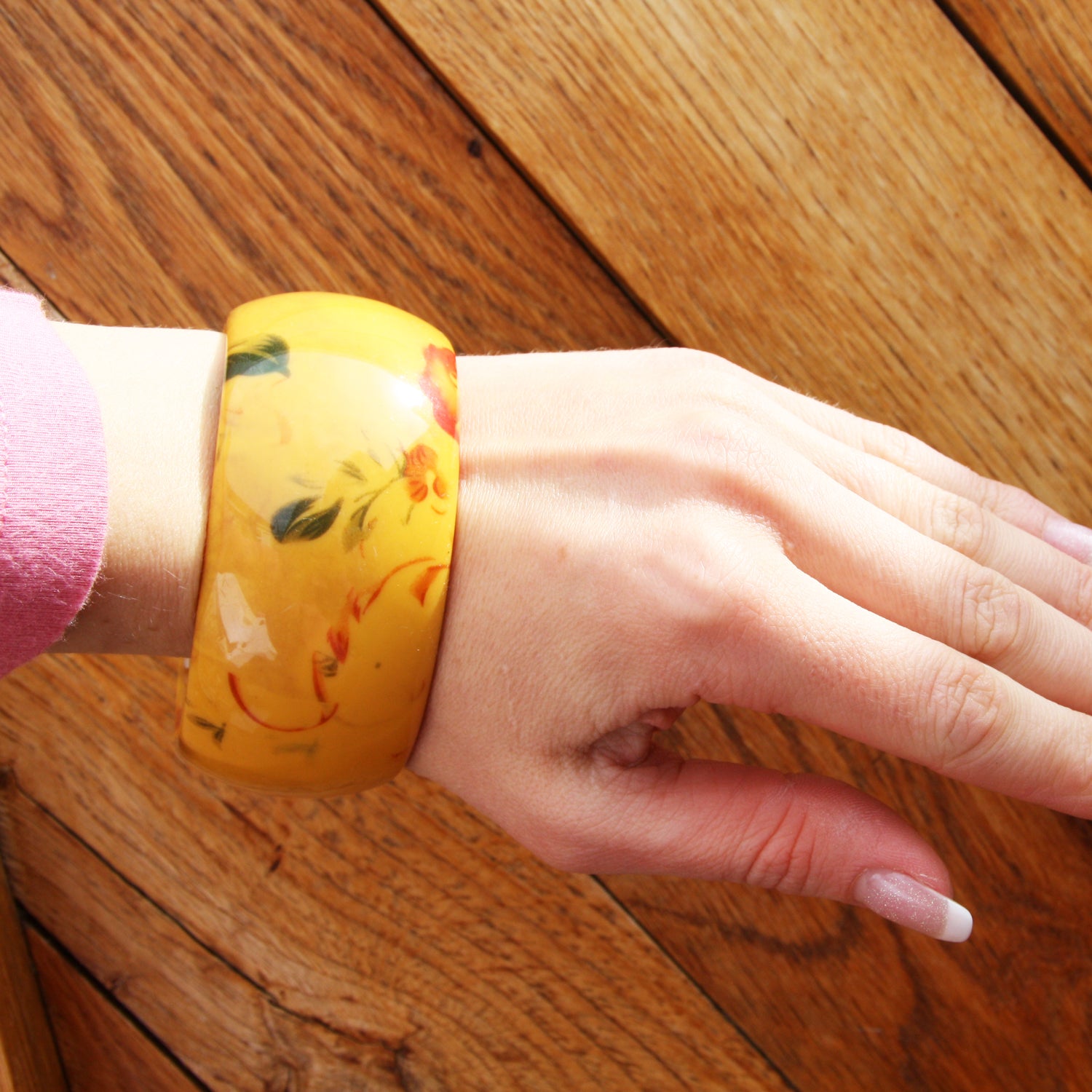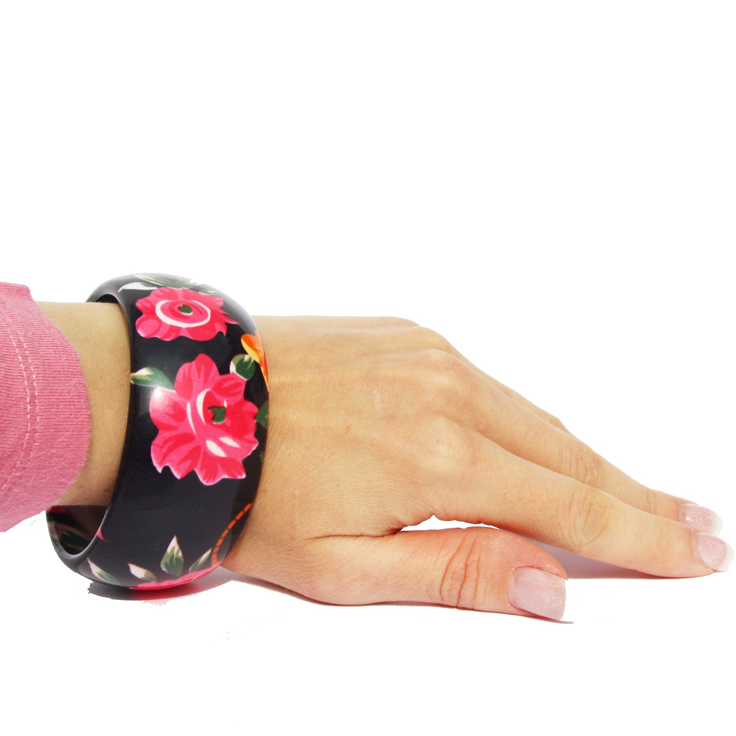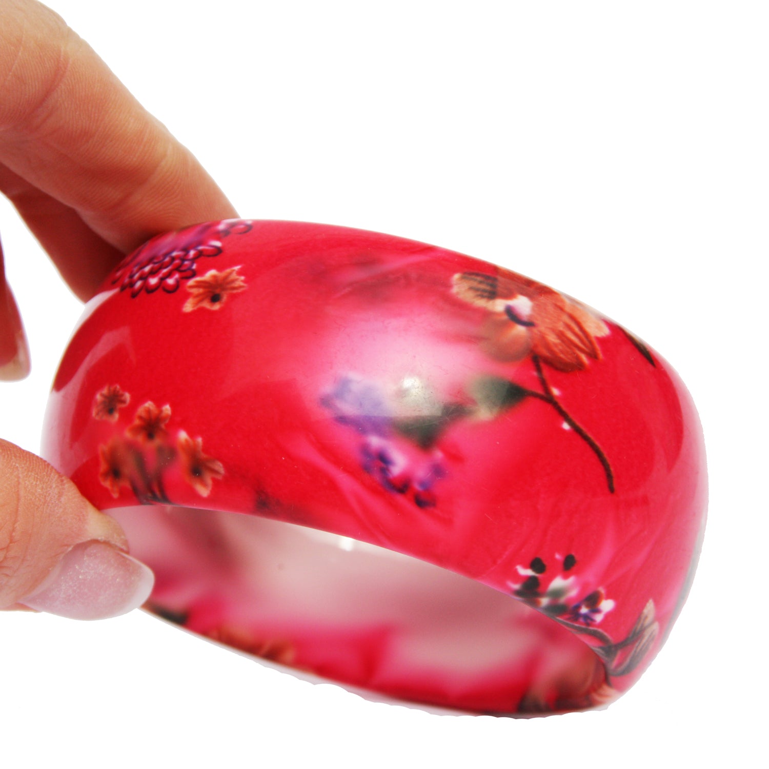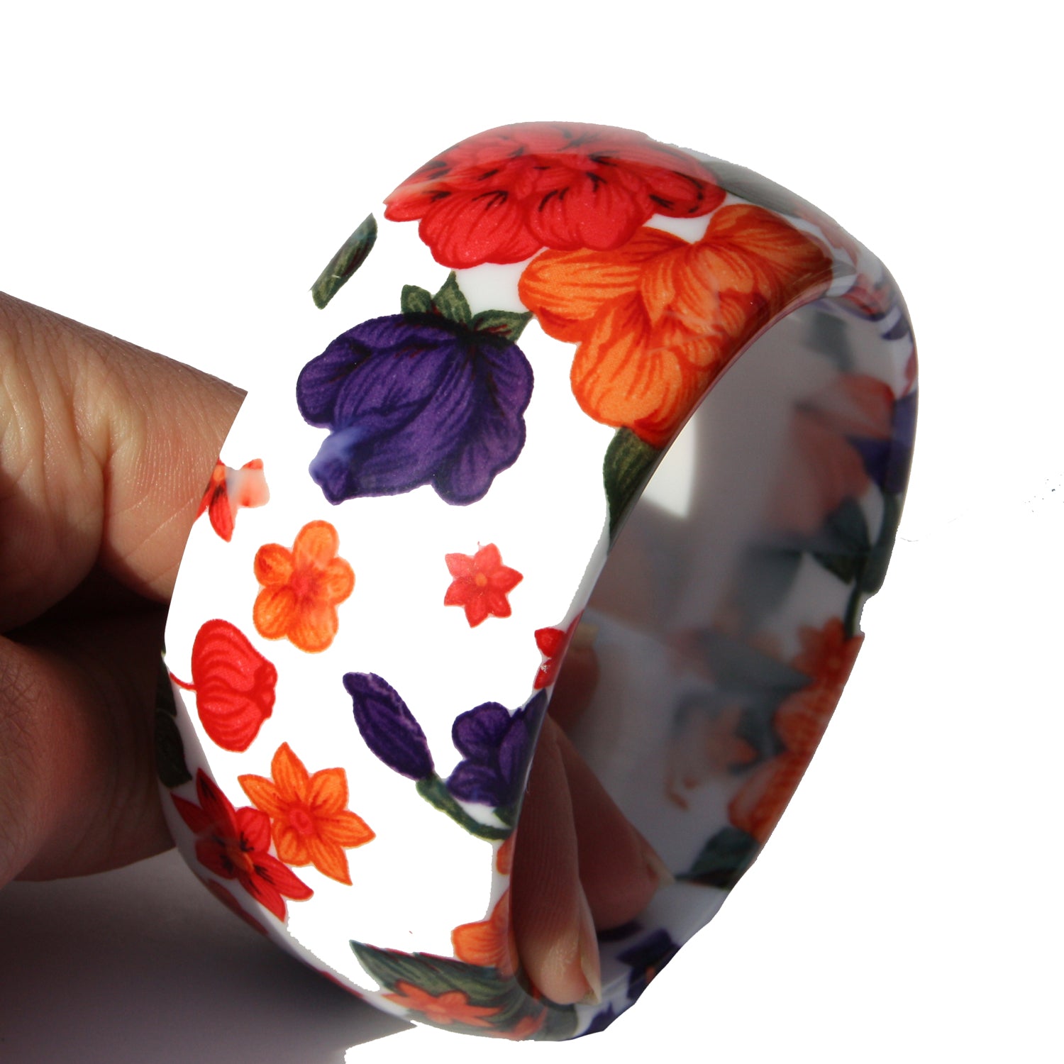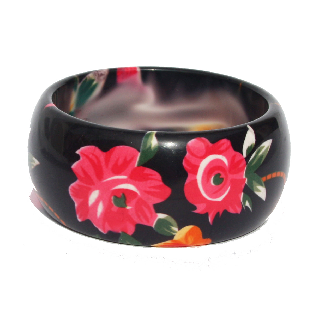 Floral Bangle. This is a really colourful bangle with a pretty floral print. It is about 3cm wide and the inside diameter is 6.5cm