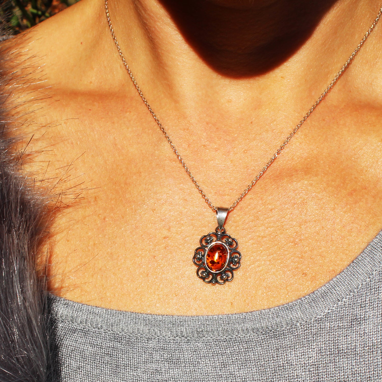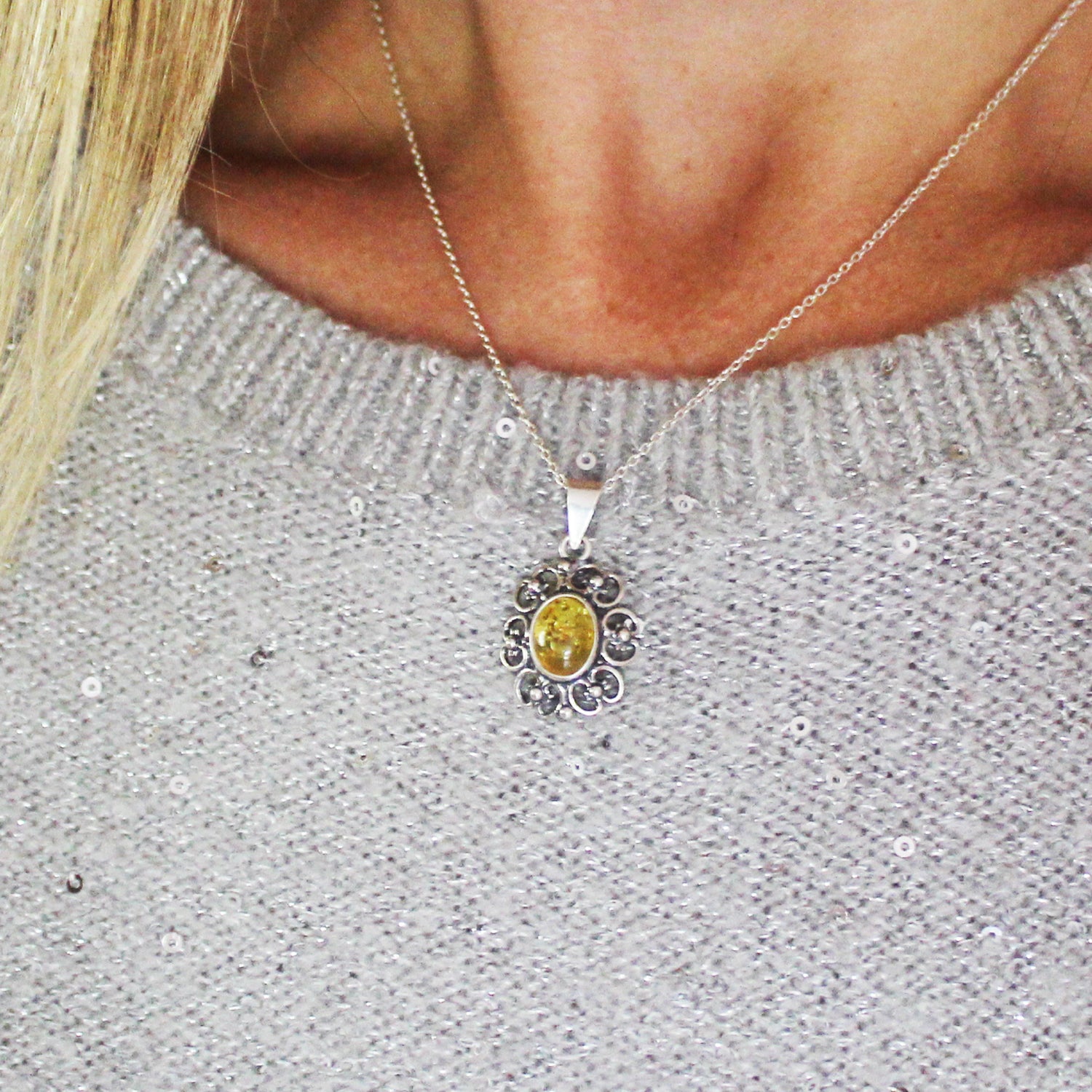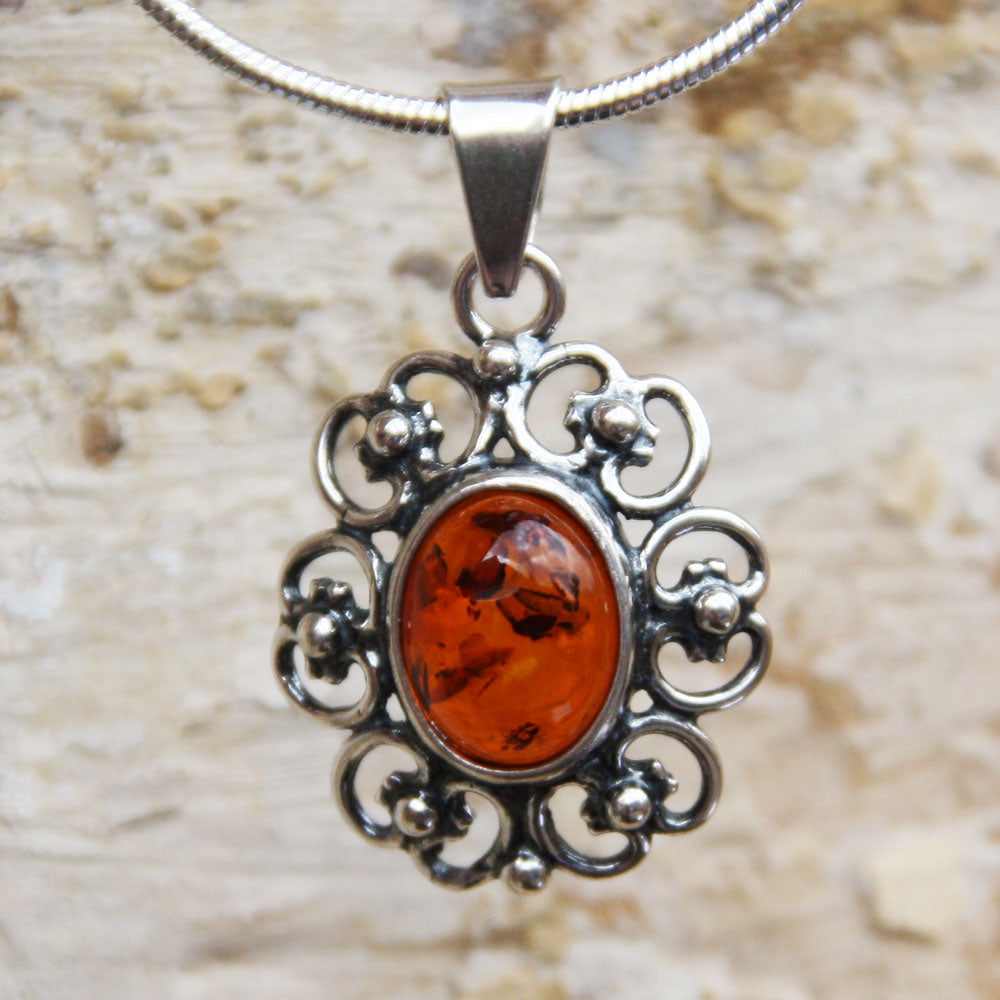 Classic Vintage Oval Honey Amber Sterling Silver Pendant. Genuine Baltic Amber and pure 925 sterling silver oval shape.